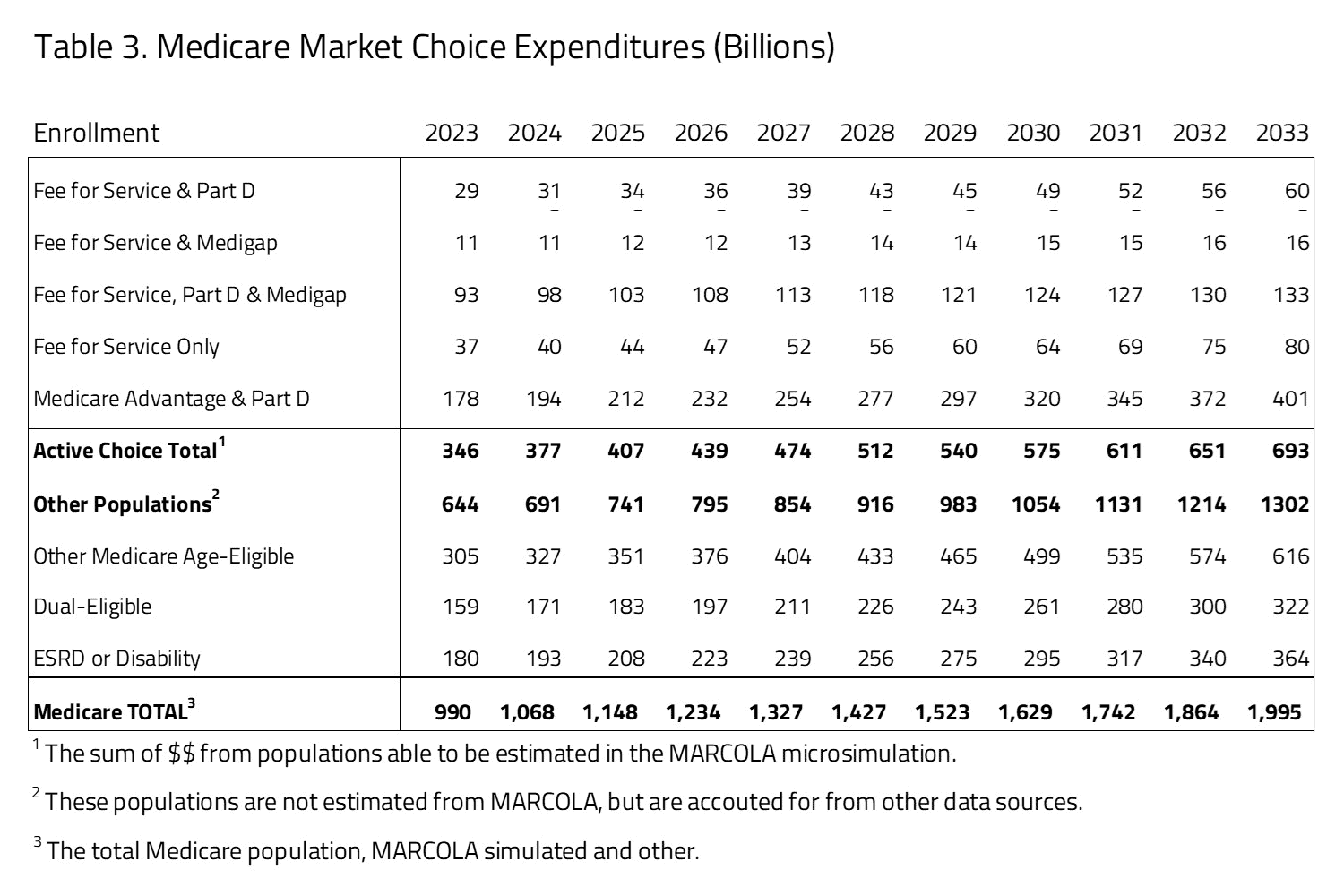 Ten-year Medicare projected expenditures are presented in Table 3. Over the decade spanning between 2023 and 2033, H&E estimates that elderly coverage provisions under Medicare Market Choice will cost $15.9 trillion. Medicare costs associated with the first population of Medicare active choice consumers have an expenditure of $346 billion in 2023 that will grow to $693 billion in 2033. The largest product within this group is the Medicare Advantage population with expenditures growing from $178 billion in 2023 to $401 billion by 2033. The non-active choice, second group has a total expenditure of $644 billion in 2023 that will grow to $1.3 trillion by 2033.