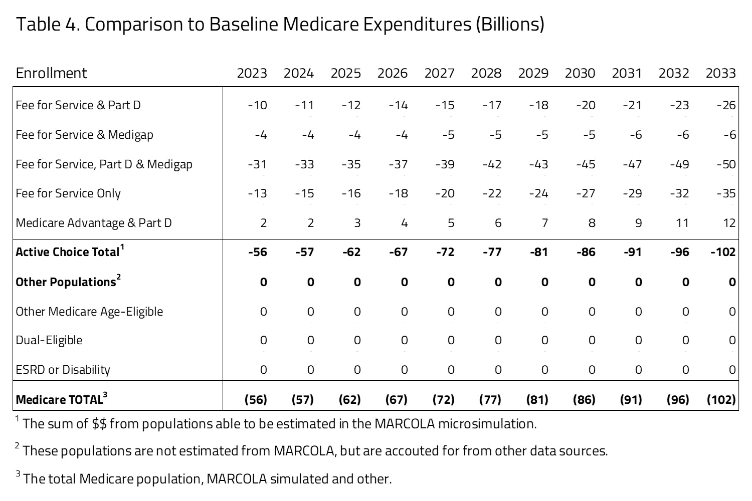 Table 2 provides the impact on enrollment between the Medicare Market Choice proposal and status quo Medicare program. The status quo comparison is based on the H&E MARCOLA baseline estimate published in November 2023. There will be a shift from Medicare FFS to Medicare Advantage of 2.4 million in 2025 and 3.0 million by 2033. The greatest shift will occur from the Medicare FFS, Part D, and supplemental plan choice with a substantial reduction in population by 2033 of 0.6 million, most of whom are absorbed by an expansion in the Medicare Advantage population. Because Medicare coverage is mandatory, we assume that the net effect on total insurance coverage is zero.