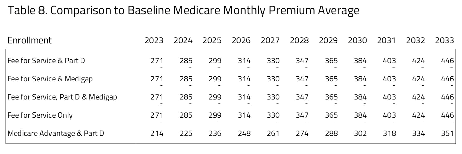 - The premiums paid by seniors will be significantly higher under Market Choice for the FFS population, with additional premiums ranging from $271 to $446 over the 10-year period of time. This accounts for the higher cost of pricing Medicare FFS as a choice based on its current cost. Medicare Advantage has the lowest premium ranging from $214 to $351 per month from 2023 to 2033.