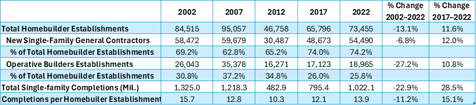 Together, the total number of homebuilder establishments sank 13.1 percent between 2002–2022.