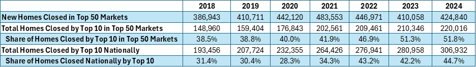 *Source: BUILDER 100 Surveys, U.S. Census Bureau; author’s calculations; companies included in the top 10 are based on the total number of homes closed by year.