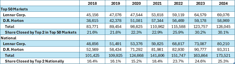 The market share of these two firms was even greater in the top 50 metro areas, reaching 30.1 percent in 2024.