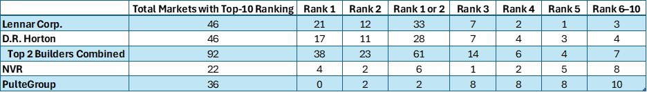 Narrowing geography to the MSA level, however, is more indicative of competition as home building is almost exclusively done locally. In 2024, 25 companies were among the top two builders in each of the top 50 MSAs. Lennar and D.R. Horton led the count, making the top two, 33 and 28 times, respectively. NVR was third with six appearances (Figure 6).