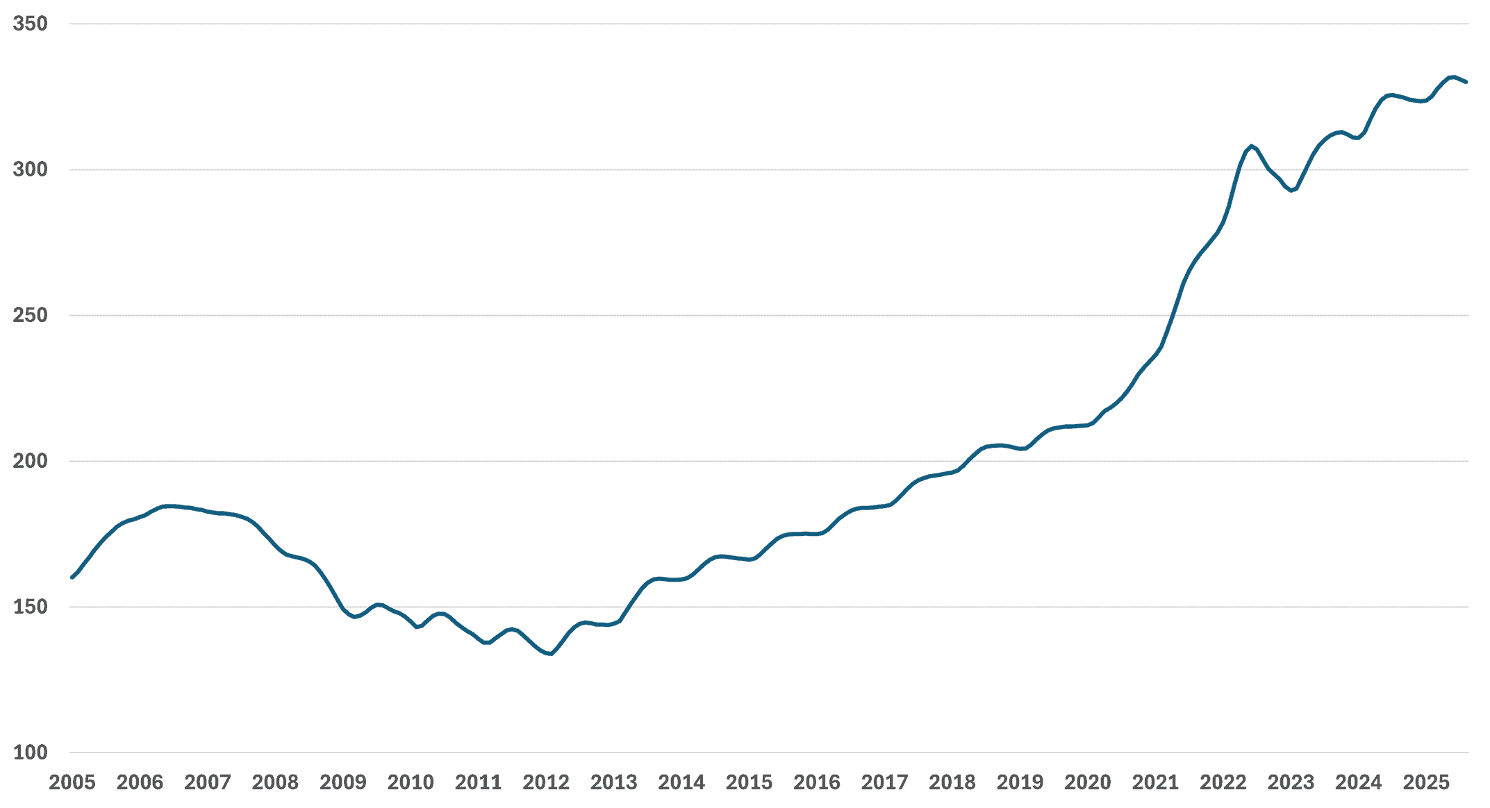 The U.S. national home price index increased 55 percent between January 2020 and August 2025, according to recent data from S&P Case-Shiller (Figure 8).