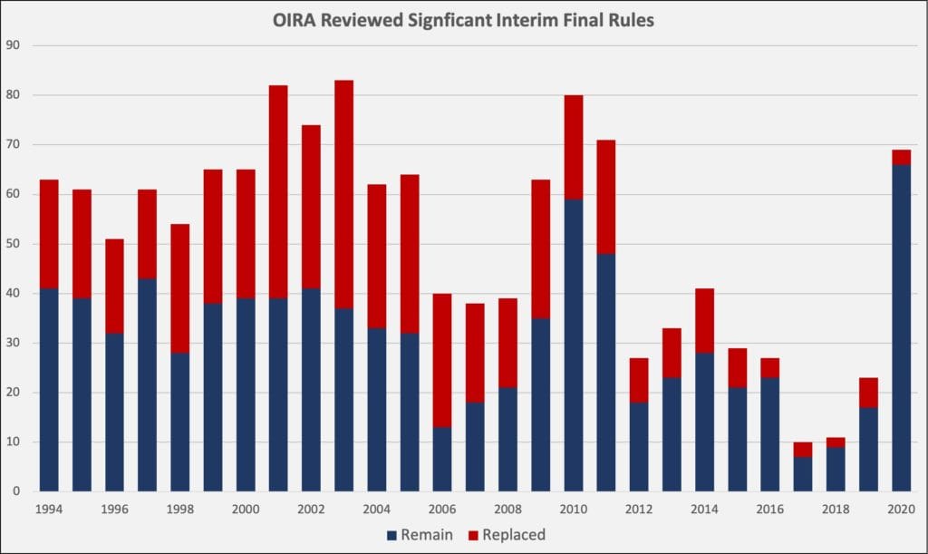 With OIRA’s review of regulations under Executive Order 12,866, however, one can comprehensively examine all IFRs (by Regulation Identifier Number, or RIN) deemed significant enough for OIRA to review, and see which RINs were subsequently reviewed as final rules or supplanted by further IFRs.