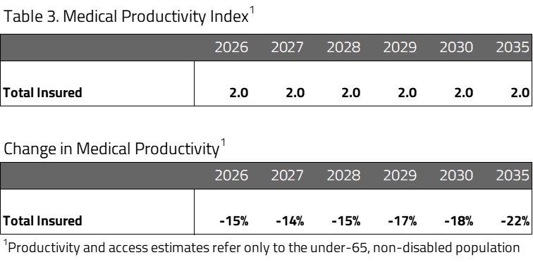 - Under the Plan, medical productivity is projected to decrease by 22 percent for the year 2035 relative to the current baseline due to the massive increase of patients into the health system and the dissolution of network structure.