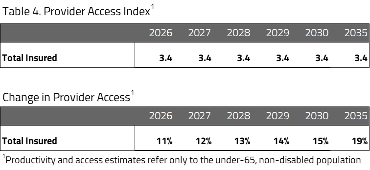 Table 4 describes the net provider access of all insured populations resulting from the Harris plan. Under the Plan, average provider access is projected to increase relative to current law due to the global coverage instituted by single-payer insurance. H&E also projects an increase in average provider access for the total insured population as a result of lower enrollment in Medicaid, which generally offers poor access to physicians. This projection assumes there is adequate provider supply.