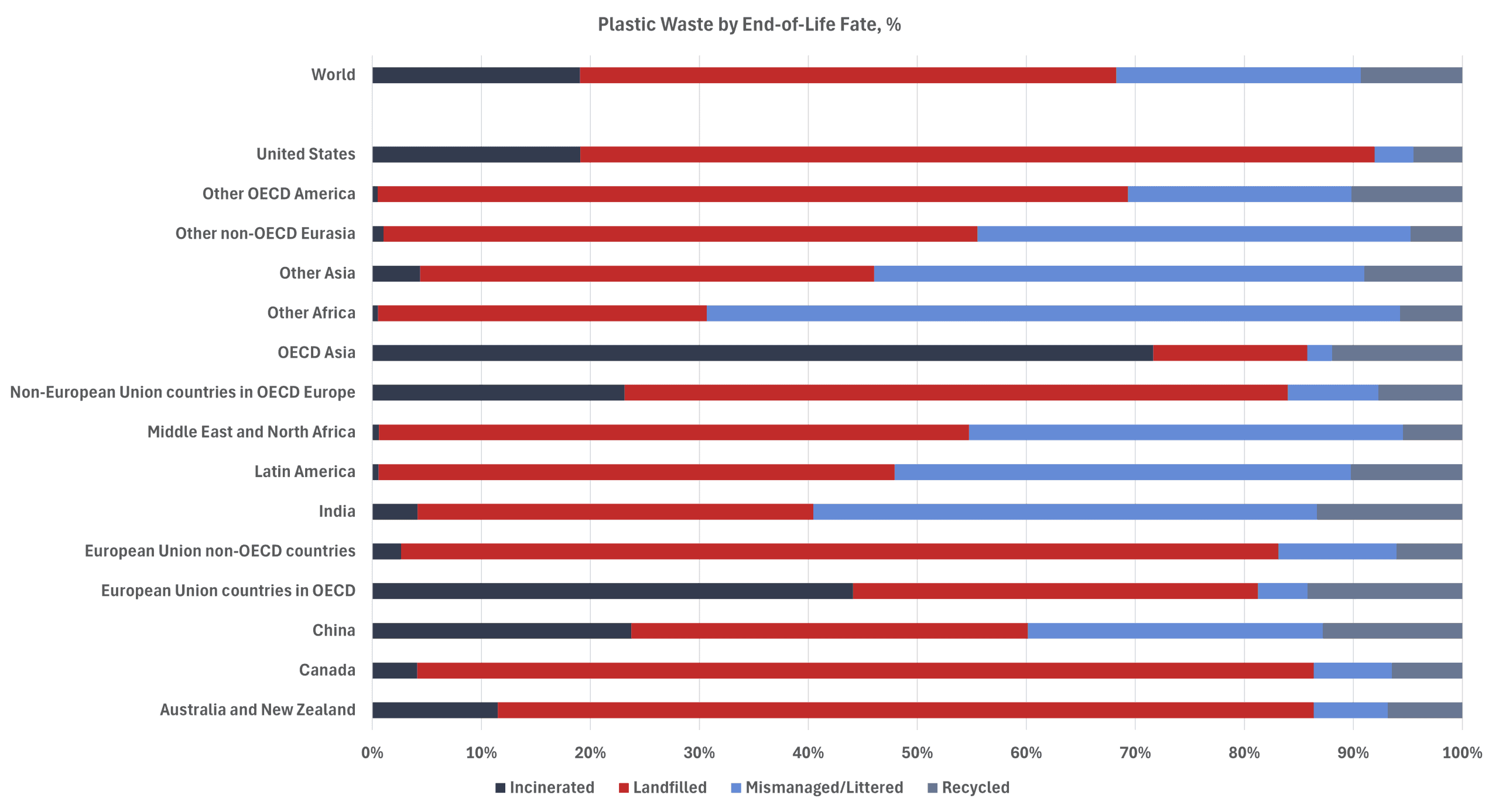 The Organisation for Economic Co-operation and Development (OECD) estimated that 9 percent of the 353 million metric tons of plastics waste was recycled in 2019. Meanwhile, 49 percent of plastics waste ended up in landfills, 22 percent was either mismanaged – plastics waste that is not properly disposed of and can end up in uncontrolled dump sites – or littered, and the remaining 19 percent was incinerated. In the United States, only 4 percent of plastics waste was recycled while 73 percent ended up in landfills.