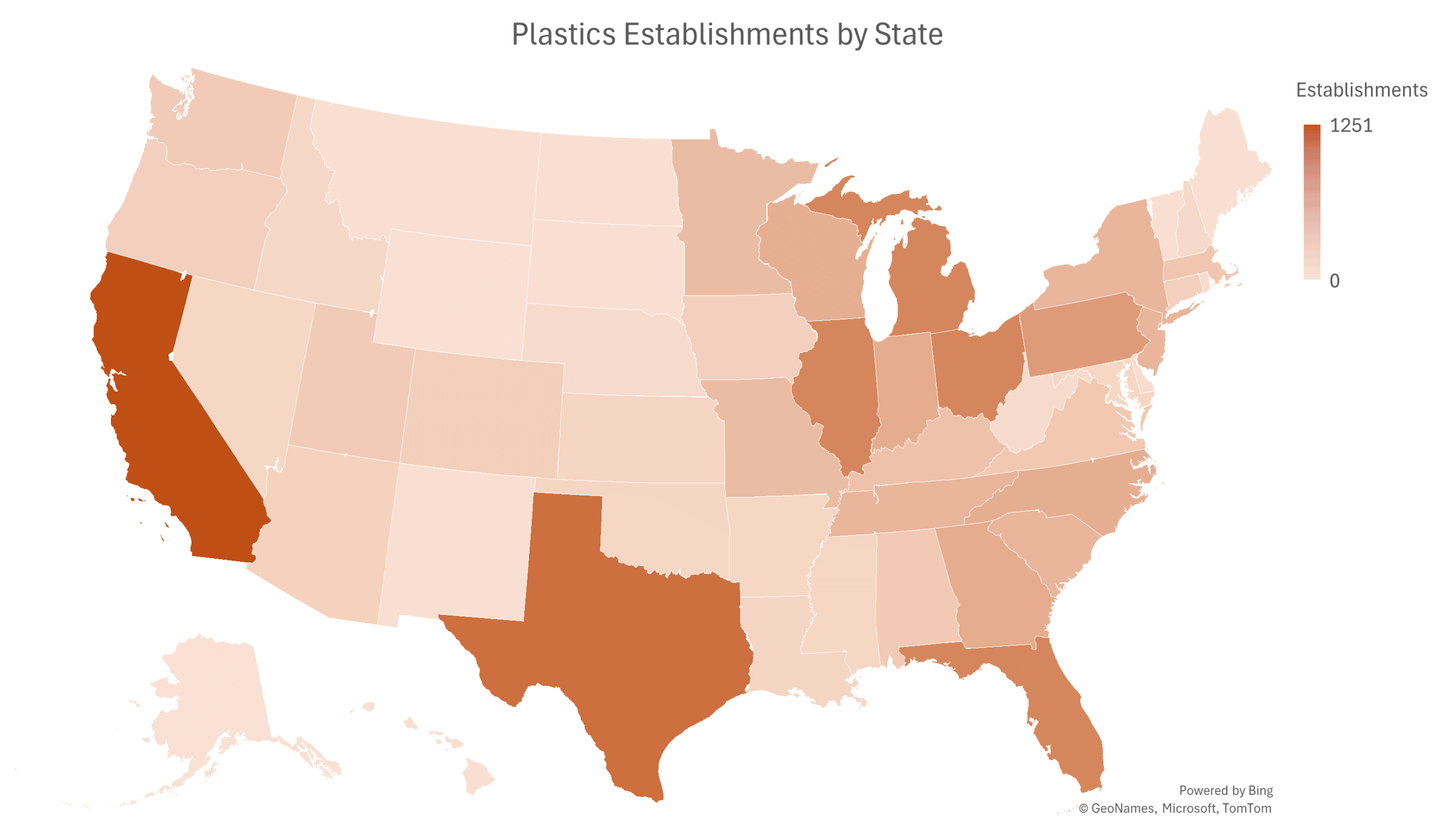 The physical presence of more than 13,500 plastics industry establishments sprawled across 49 states, the District of Columbia, and Puerto Rico. California was home to 1,251 establishments while Texas had nearly 1,000.