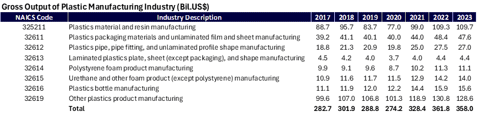 Plastic manufacturers produced $358 billion of gross output in 2023, according to the Bureau of Economic Analysis. Gross output increased by 26.6 percent between 2017 and 2023.