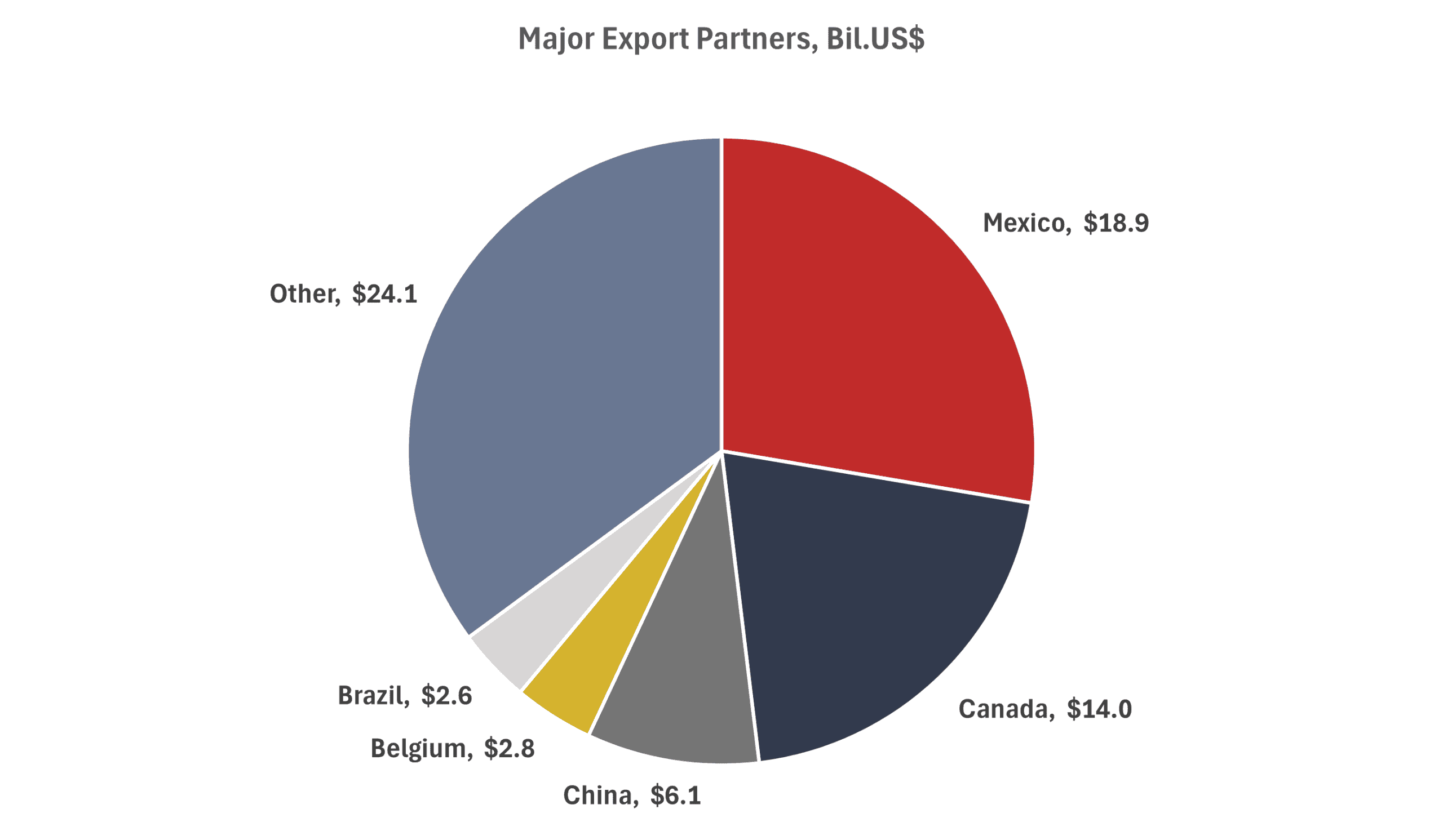 Mexico and Canada were among the largest export destinations with exports of $18.9 billion and $14.0 billion, respectively. These two countries accounted for nearly half of all plastics industry exports.