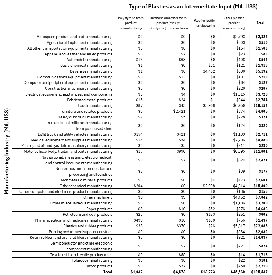 A more detailed breakdown shows the type of plastics used as an intermediate input across 37 manufacturing industry groups.