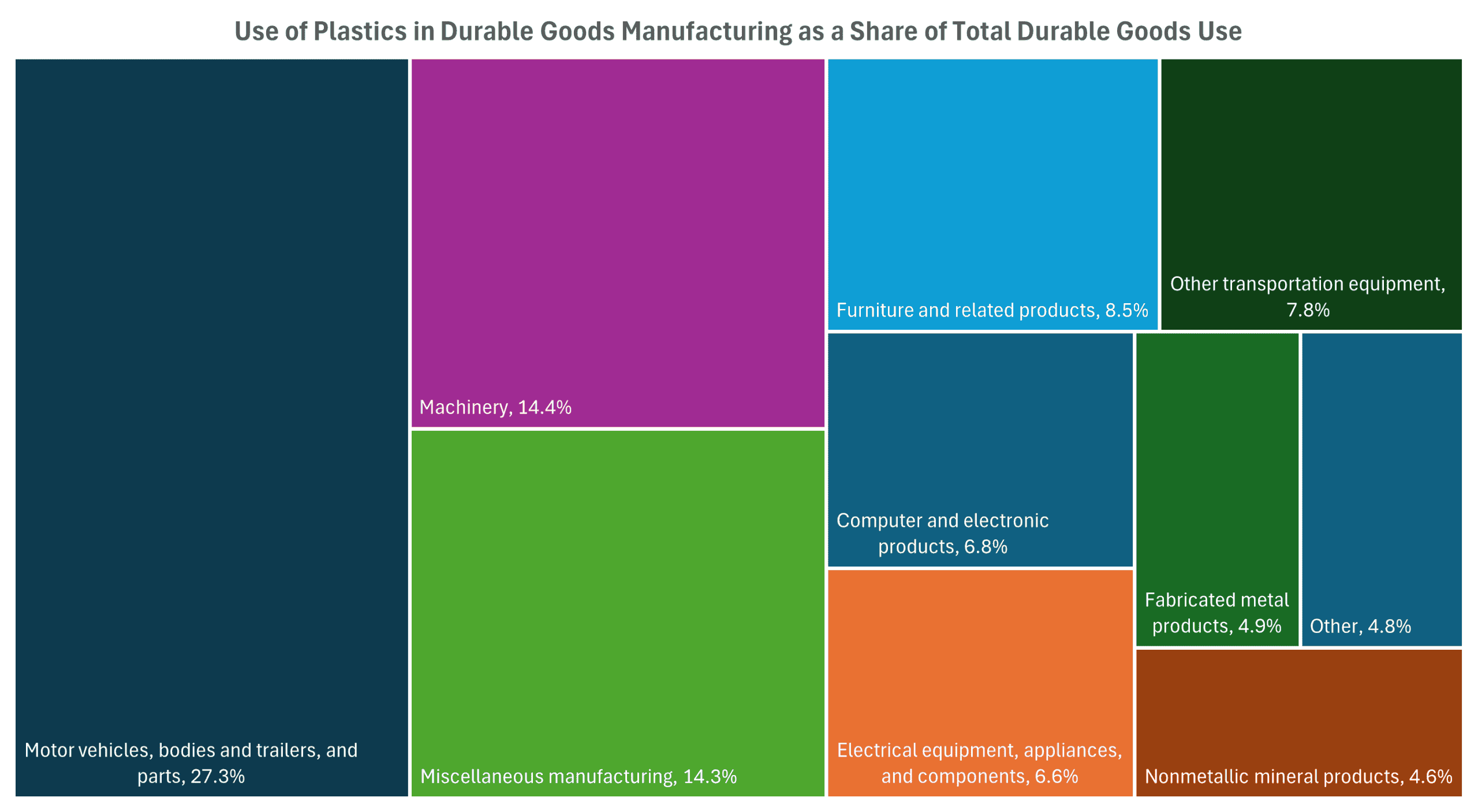 Motor vehicles, bodies and trailers, and parts manufacturing used 27.3 percent of plastics used in durable goods manufacturing, while machinery manufacturing used 14.4 percent.