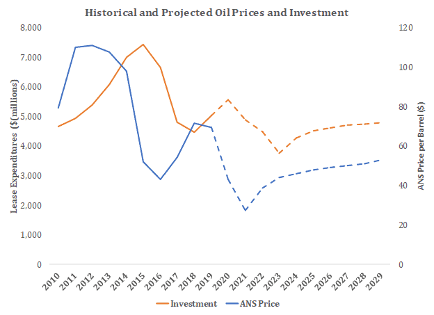 In 2019, there was $5.031 billion in lease expenditures invested in petroleum production in Alaska.[19] This study projects lease expenditures activity based on historical price relationships to establish an investment baseline. It recognizes that considerable uncertainty attaches to such a projection. It projects that over the 2021-2029 period, the oil and gas industry would invest nearly $41 billion in operating and capital lease expenditures.
