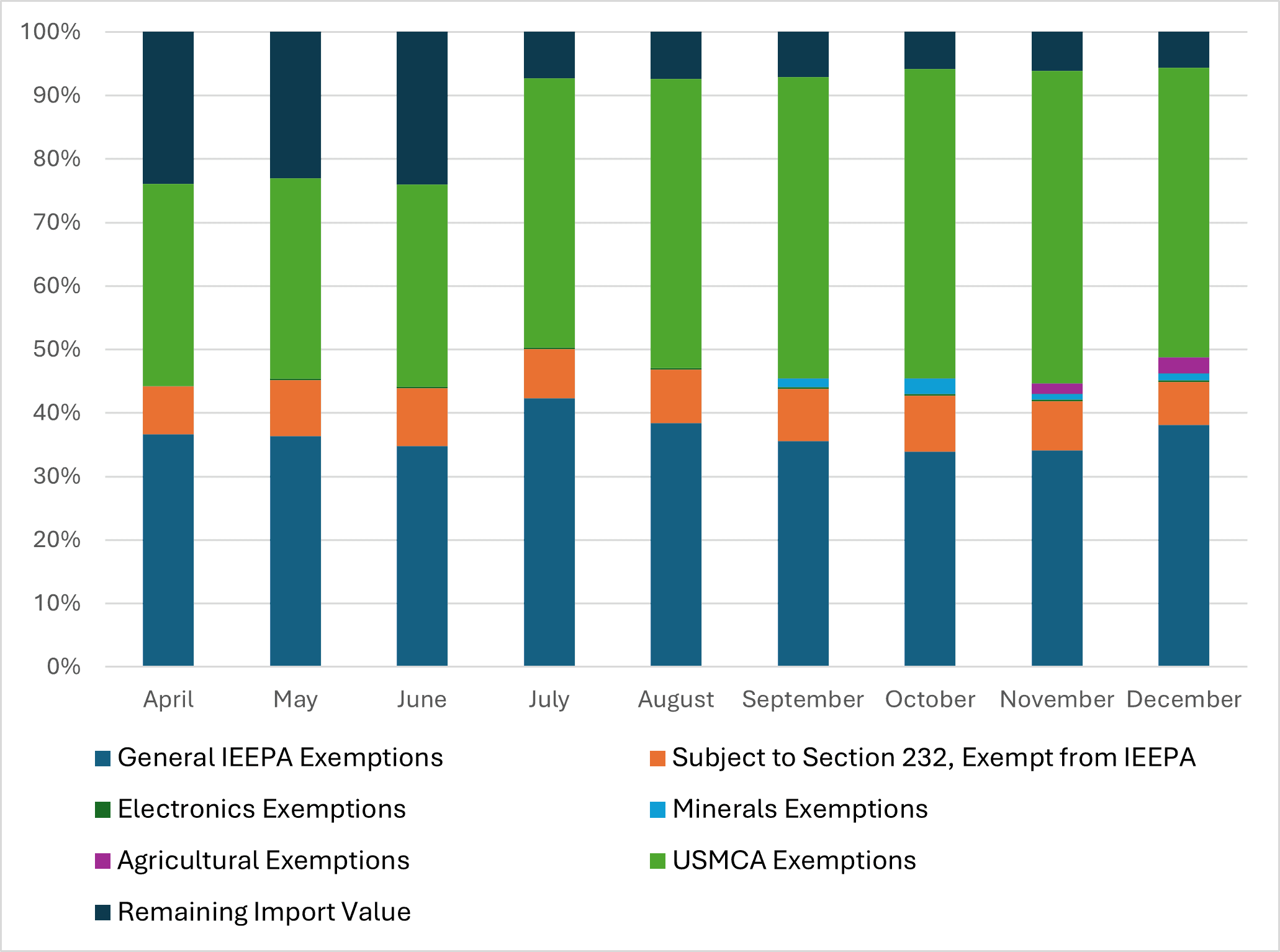 Figure 8: USMCA and IEEPA Exemptions as a Percent of Monthly Import Value (2025)
