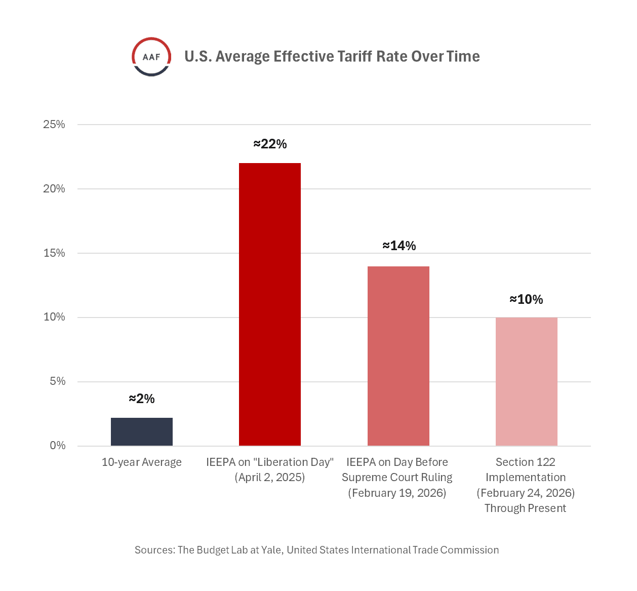 On February 20, 2026, the Supreme Court ruled that President Trump’s use of IEEPA to impose tariffs exceeded presidential authority, thereby striking down the IEEPA tariff regime. Immediately after, the Trump Administration turned to Section 122 of the Trade Act of 1974 which allows the president to implement tariffs up to 15 percent on imports for a maximum of 150 days. The president elected to impose 10-percent Section 122 tariffs which took effect on February 24 and drop the U.S. effective tariff rate to around 10 percent. Section 122 tariffs will expire July 24 unless they are renewed by Congress; they may be struck down sooner if the ongoing court case challenging their legal footing is decided expeditiously.