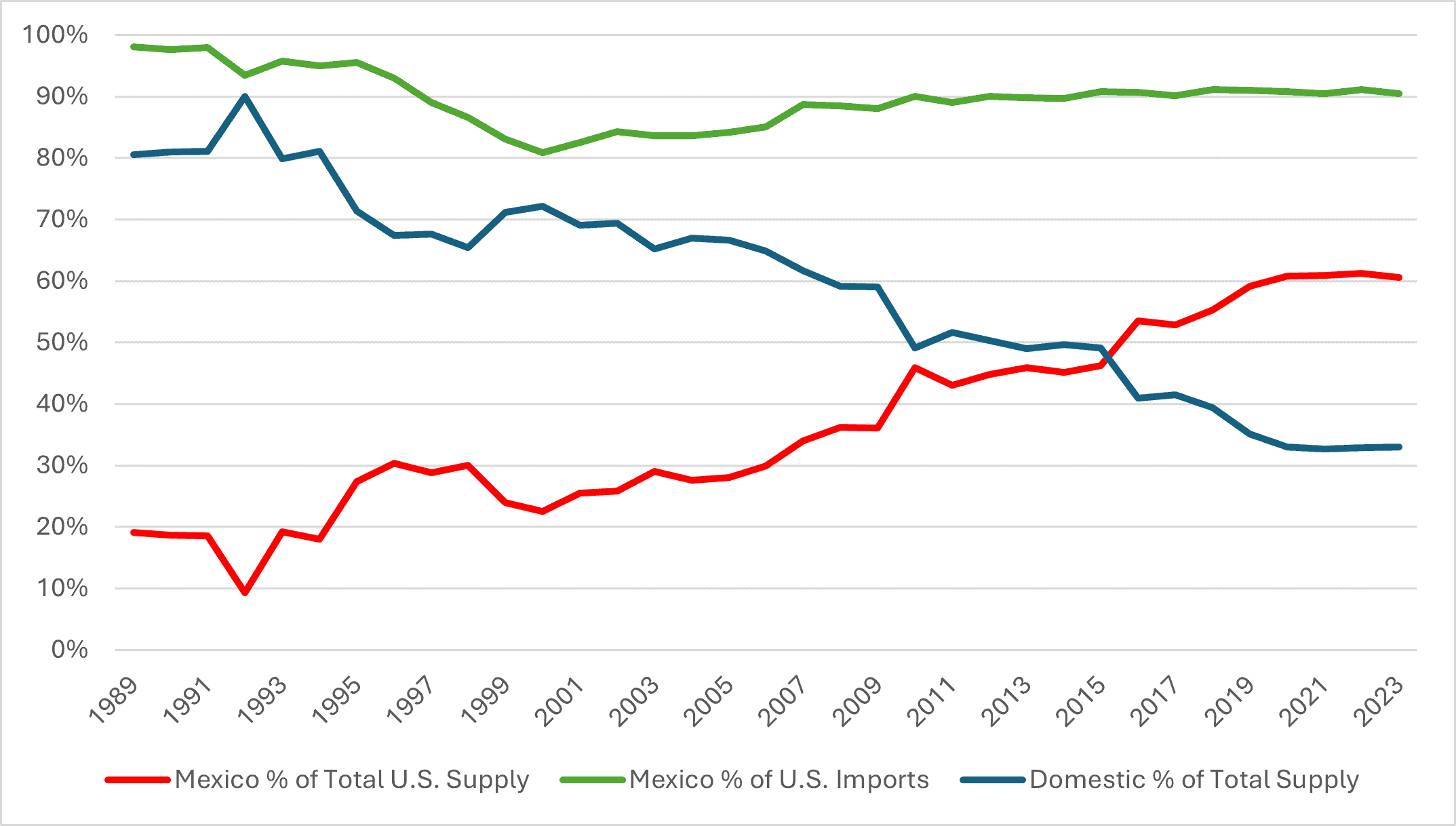 Figure 2: Mexico as a Percentage of Fresh Tomato Imports and Total Fresh Tomato Supply