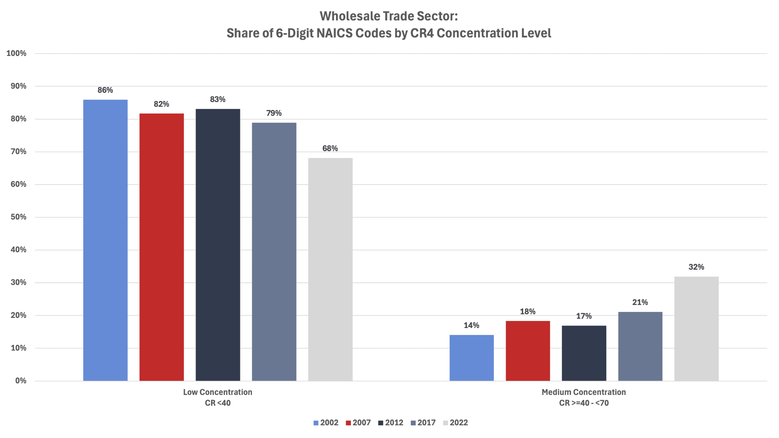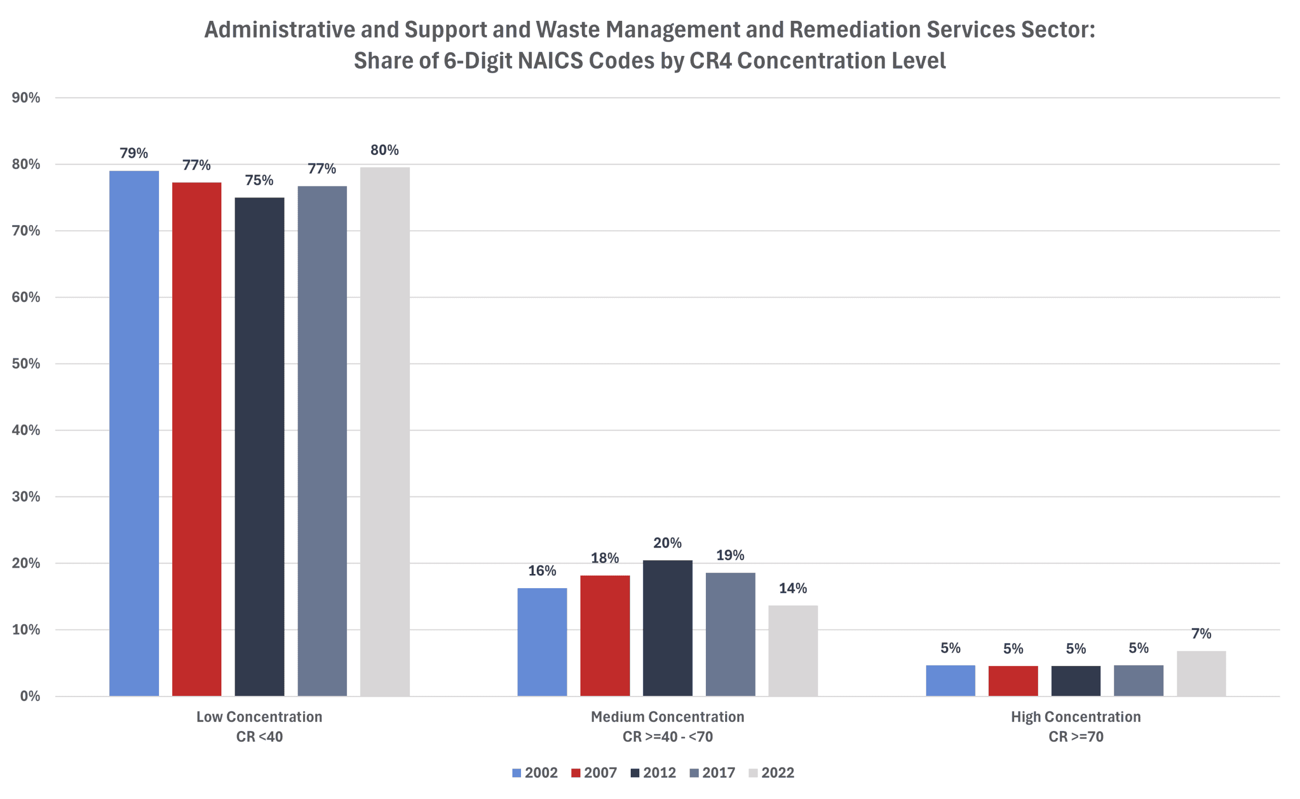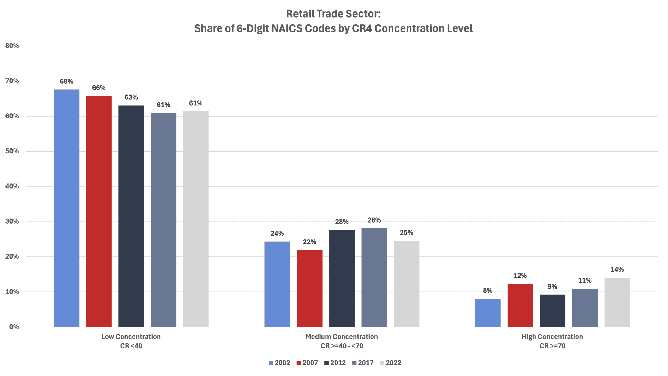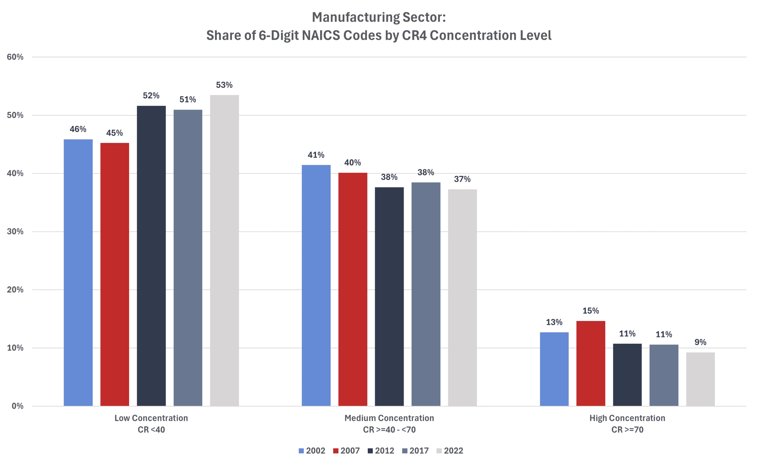 The average CR4 for all 6-digit NAICS industries in 2002 was 35.0 percent. That level increased to 36.8 percent in 2007 before falling to 35.2 percent in 2012, to 34.8 percent in 2017, and to 34.7 percent in 2022 (the last year for which there are data).
