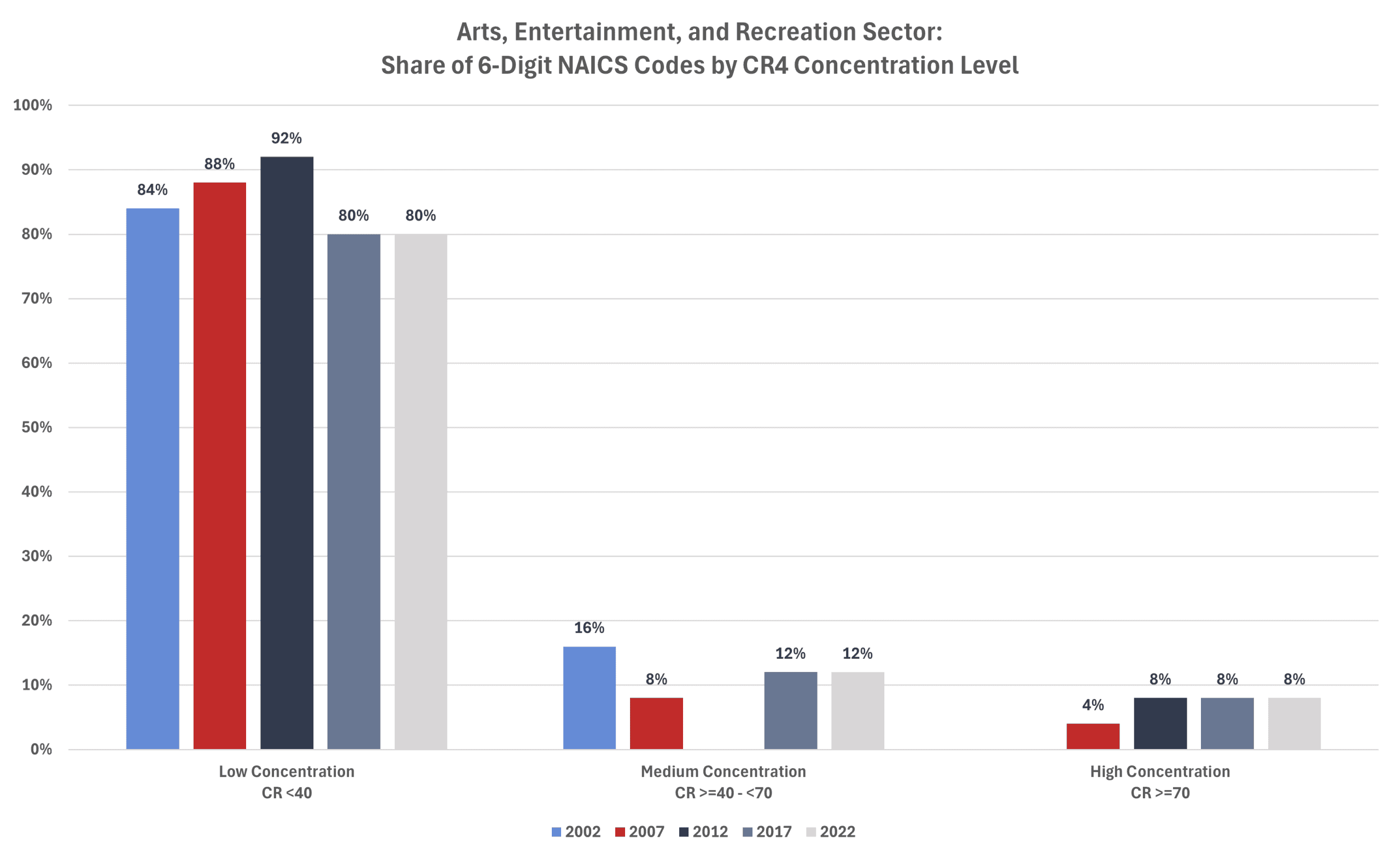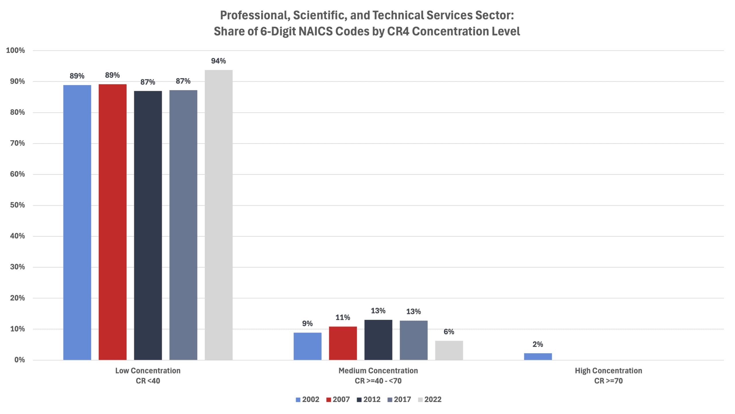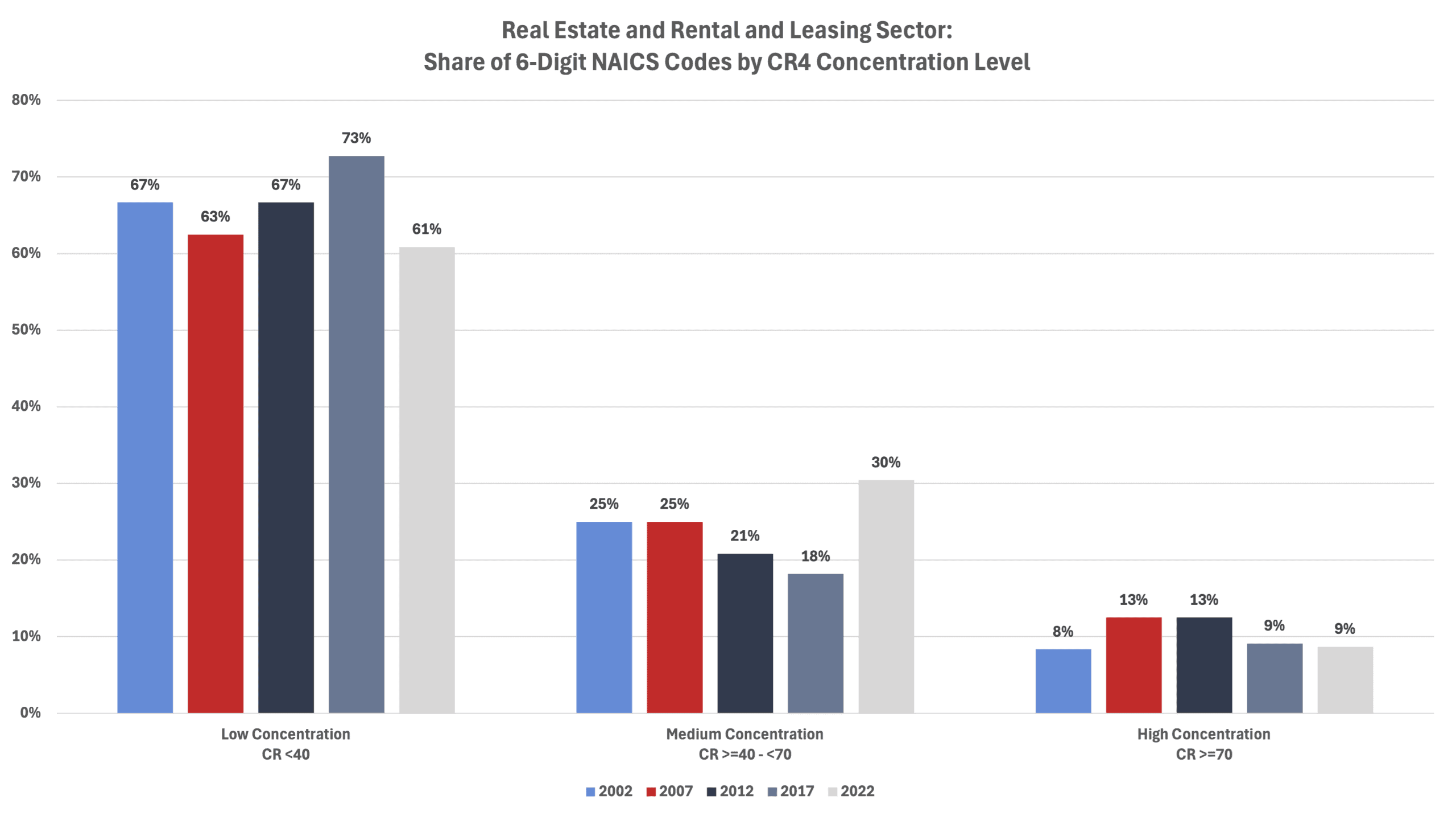 The average CR4 for all 6-digit NAICS industries in 2002 was 35.0 percent. That level increased to 36.8 percent in 2007 before falling to 35.2 percent in 2012, to 34.8 percent in 2017, and to 34.7 percent in 2022 (the last year for which there are data).