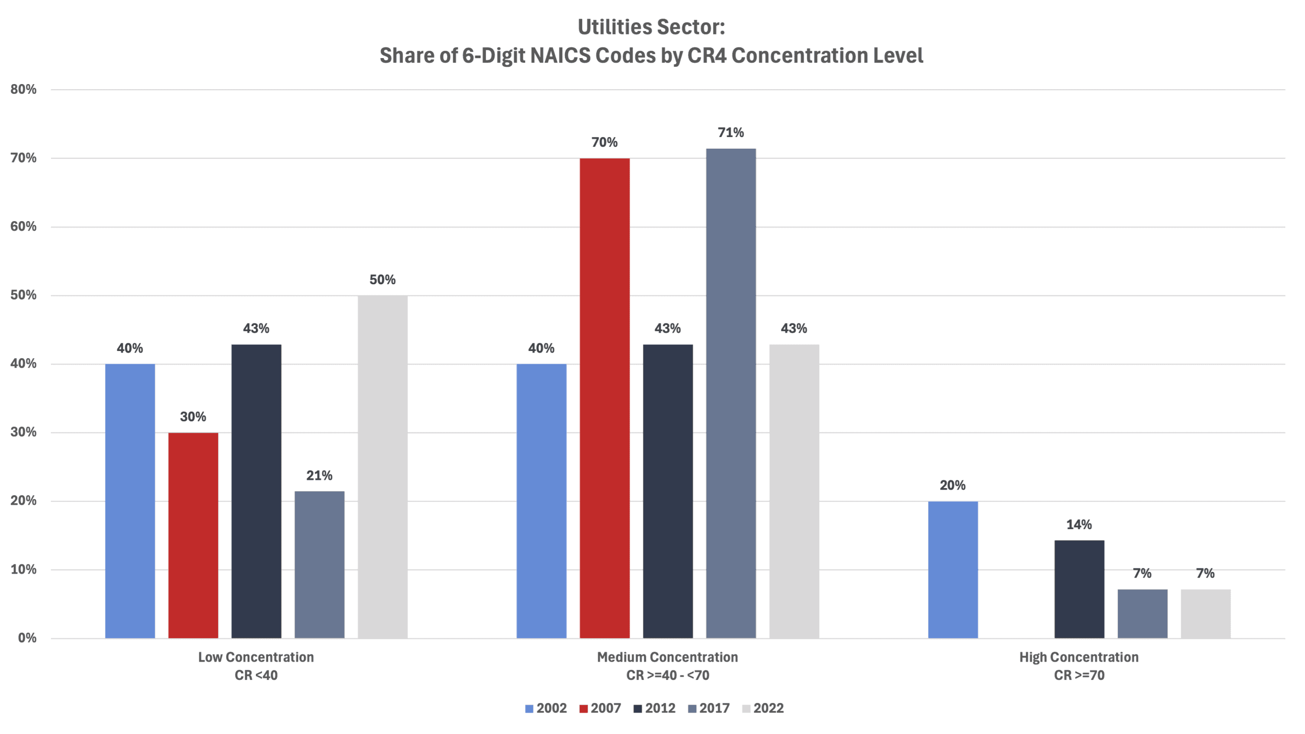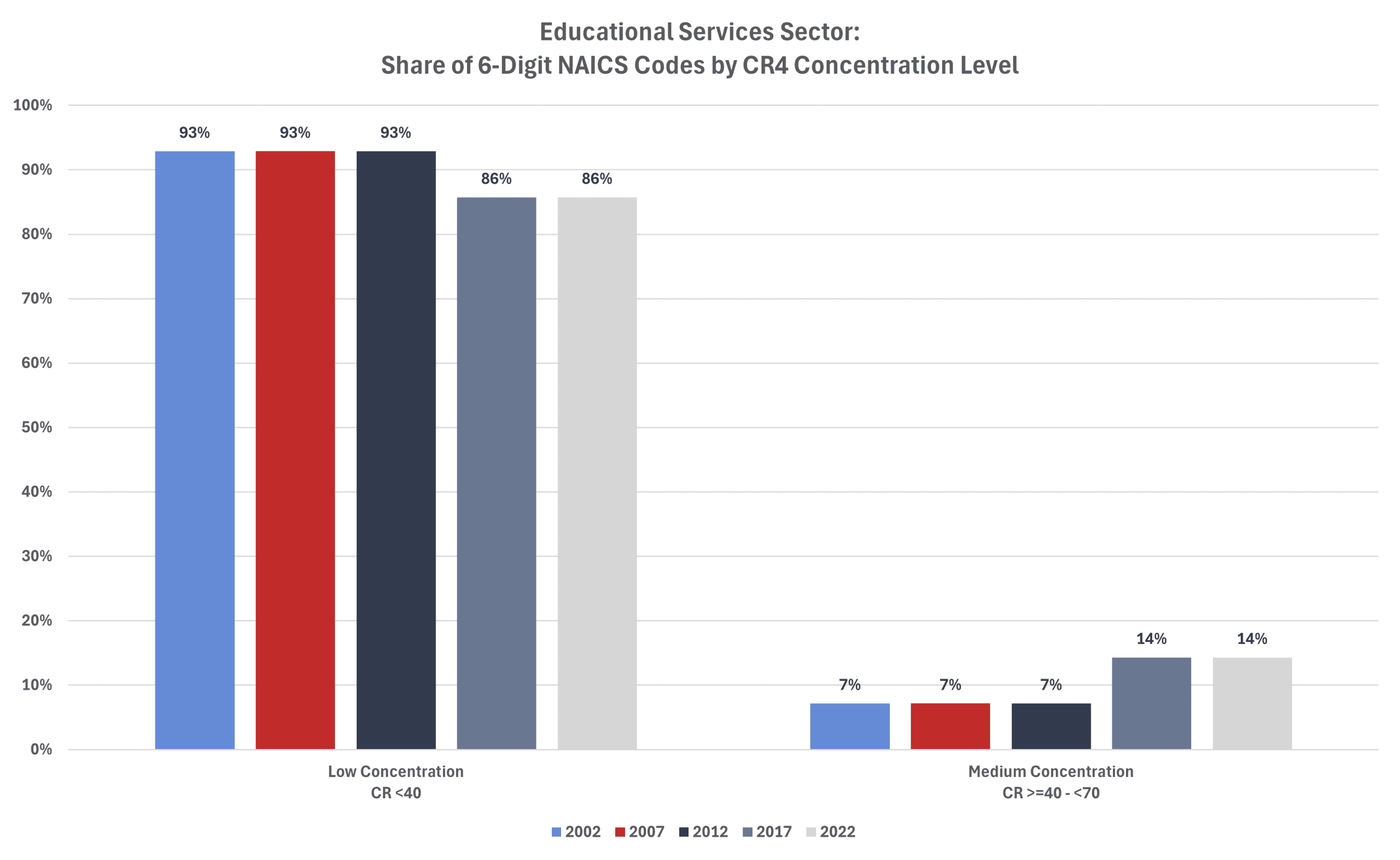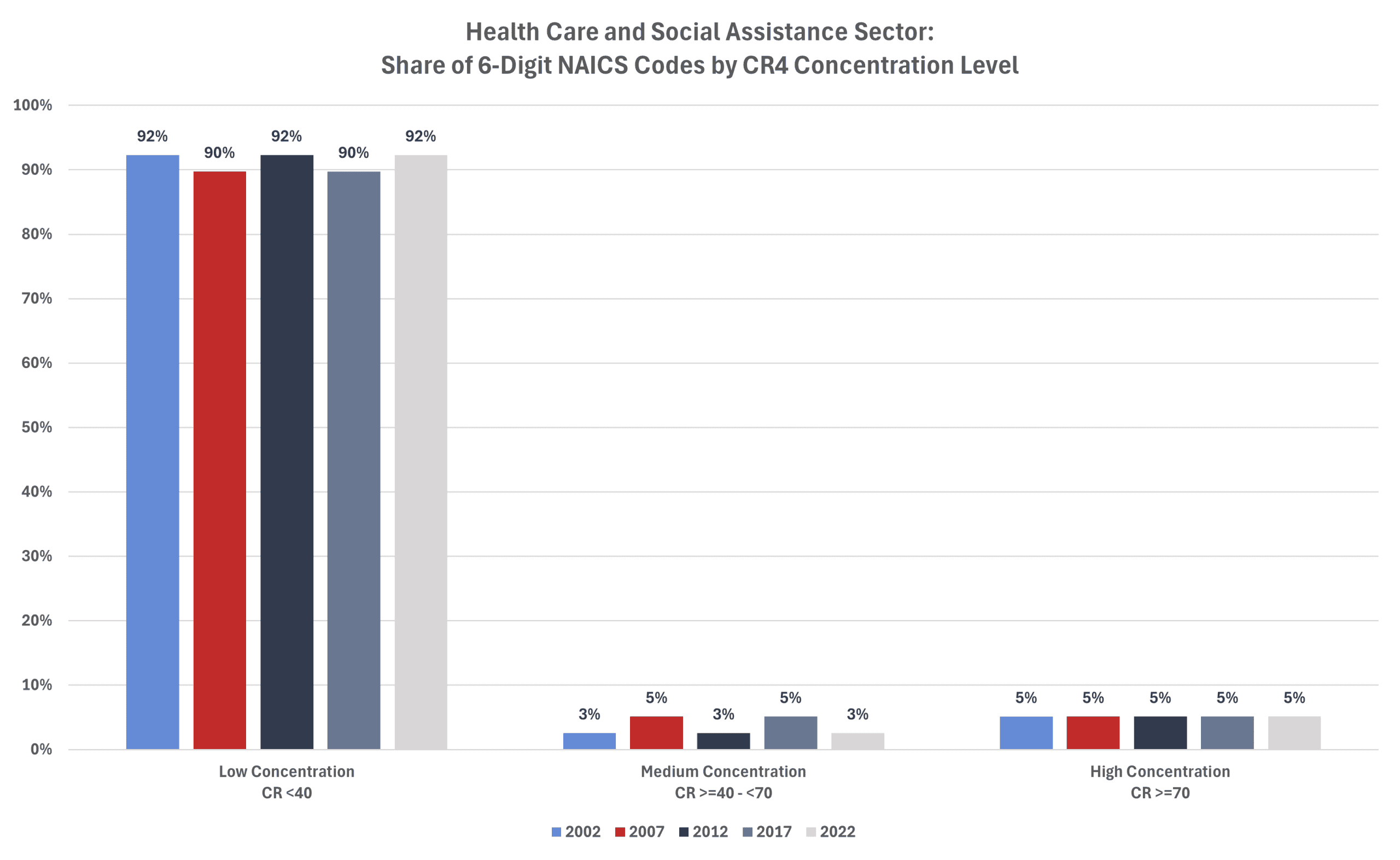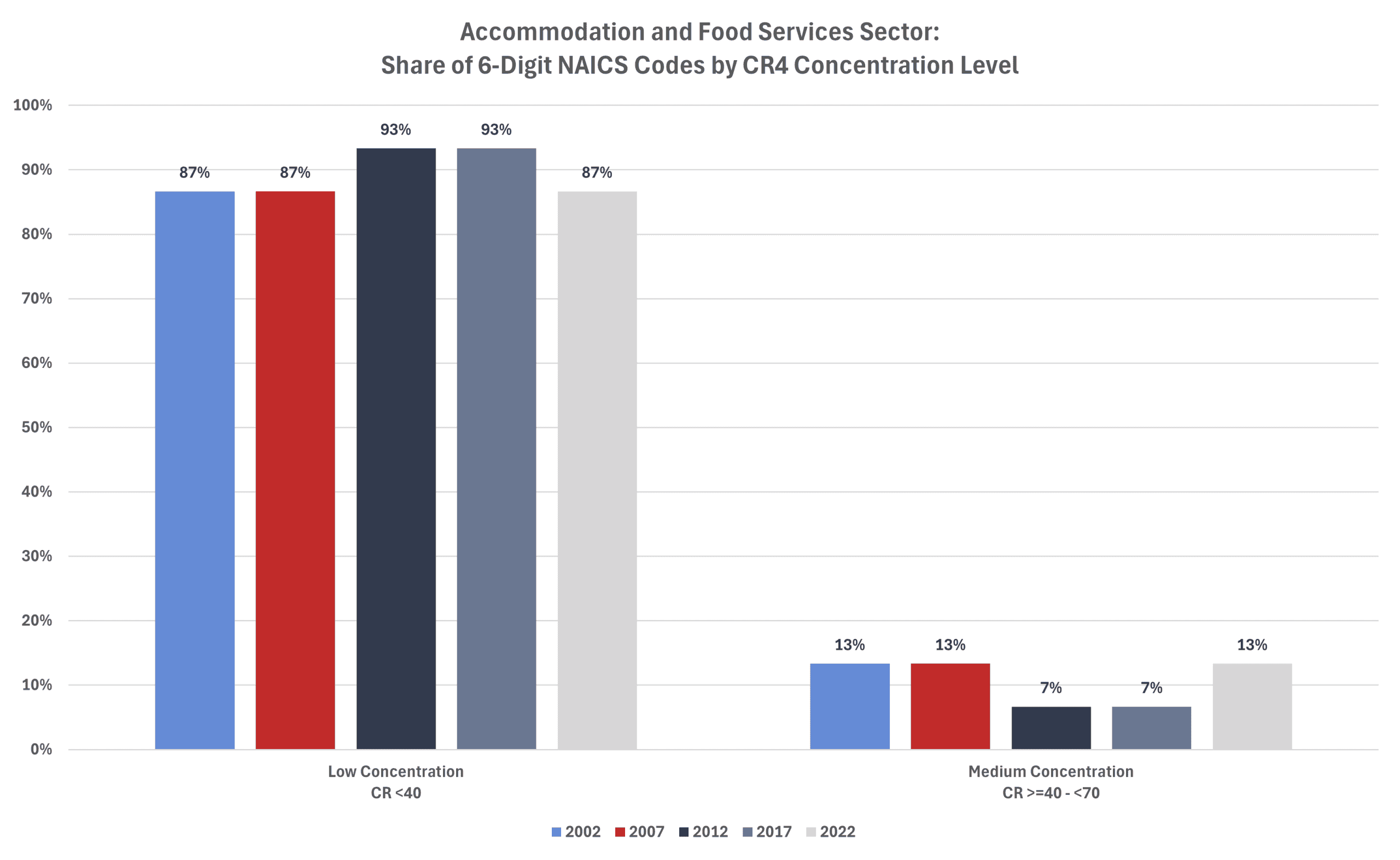 The average CR4 for all 6-digit NAICS industries in 2002 was 35.0 percent. That level increased to 36.8 percent in 2007 before falling to 35.2 percent in 2012, to 34.8 percent in 2017, and to 34.7 percent in 2022 (the last year for which there are data).