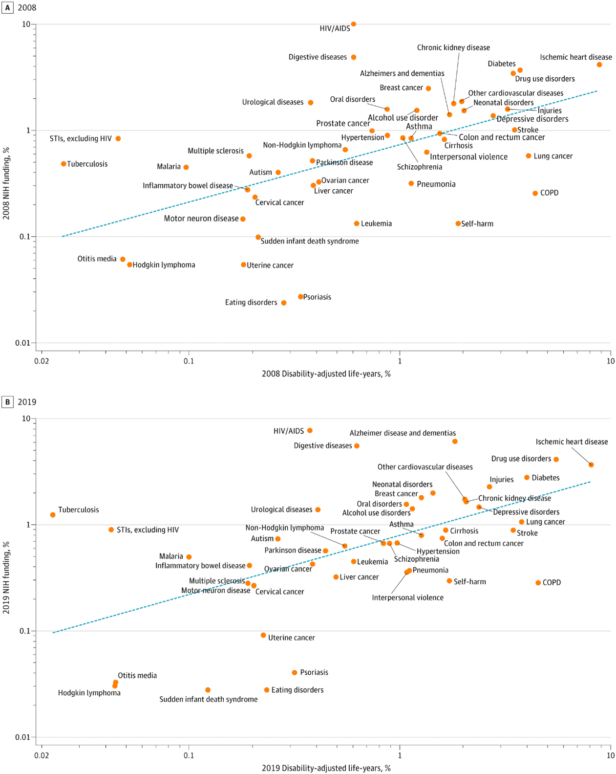 Predicting the mechanism behind misalignment is again difficult, but researchers have hypothesized certain relevant factors. A similar study on NIH investment during 2008–2019 found that NIH funding each year is strongly associated with the previous decade’s funding composition, even more so than DALY. For example, the factor most linked to NIH funding in 2019 was the level of funding in 2008 as well as 1996, not the disease burden. This analysis also identified that the same three diseases – HIV/AIDS, digestive diseases, and urological diseases – received substantially more funding in both 2008 and 2019. Assessment of the NIH’s disease allocation data found three diseases in both years that continued to be overfunded: eating disorders, uterine cancer, and psoriasis.