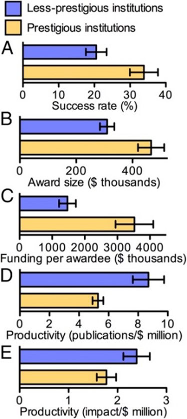 A related criticism of NIH funding is the concentration of awards among a relatively small number of large, well-established research institutions. Prestigious institutions, on average, achieve 65 percent higher grant application success rates and receive 50 percent larger award sizes. Research shows, however, that less-prestigious institutions often outperform their larger counterparts in certain metrics. Less-prestigious institutions on average produce 65 percent more publications per dollar of funding while also achieving a 35 percent higher citation impact per dollar of funding. While prestigious institutions are commonly assumed to be more productive overall, studies suggest that smaller institutions can deliver greater research output and impact relative to their funding.