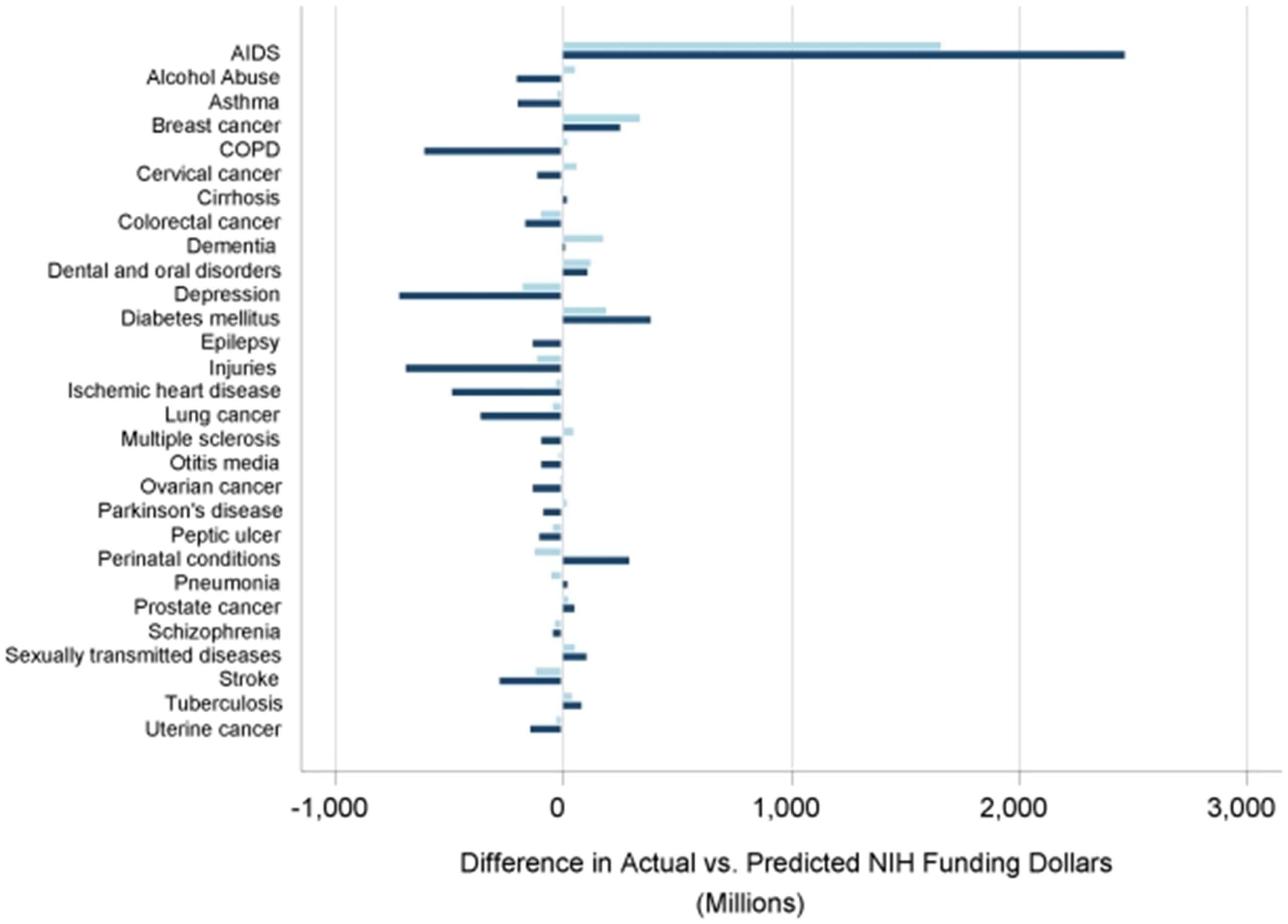 *A comparison of differences between actual and expected funding values as predicted by DALYs burden alone in 1996 (light blue) and 2006 (navy). Negative values reflect actual funding dollars less than expected and positive values represent actual funding dollars more than expected.
