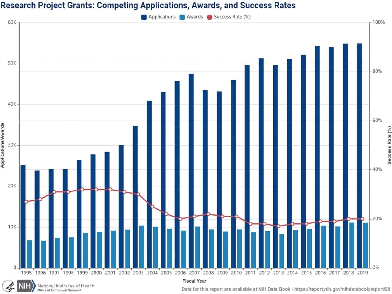 NIH funding decisions are determined by a rigorous, multidimensional review process. First, grant applications undergo a peer review, where experts from two separate organizations evaluate proposals based on their scientific merit, potential impact, and feasibility. After this initial review, applications are ranked, and only the top tier receives funding. The success rate for research project grants has hovered around 20 percent, as illustrated in the figure below. Applications have steadily increased while awards have remained relatively flat, leading to intense competition for NIH funding. This hypercompetitive environment for grant applications has led to a historically lower success rate for research project grants.