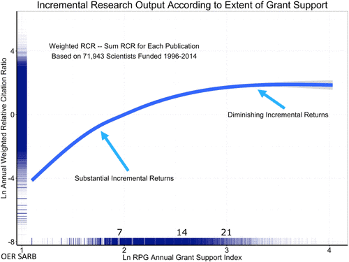 The GSI aimed to curb the disproportionate concentration of funds by capping the total grants one investigator could receive. Additionally, the GSI directly addressed the diminishing returns associated with excessive funding for individual investigators to improve overall efficiency. Studies have shown that, beyond $400,000, additional funding yields progressively smaller scientific advances, while others suggest $750,000–$1 million per investigator.