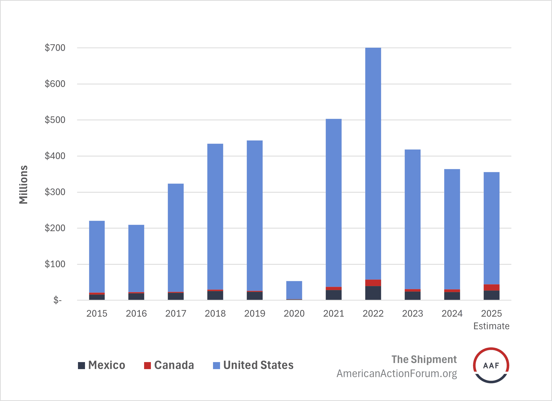 Why It Matters: There are two main issues with the administration’s current tariff dividend proposal. The first is the cost of the policy. Erica York, vice president of the Tax Foundation, estimates the rebate program to cost about $300 billion but total tariff revenues to reach $163 billion in 2025 and around $215 billion in 2026. As of November, the Bipartisan Policy Center estimates gross tariff revenue to be $228 billion while the Shipment’s updated estimate is around $250 billion, assuming current tariffs are in place for a full year. Assuming all tariff revenue is used for rebates, this means the administration will not be able to use tariffs to address the widening U.S. budget deficit or send economic assistance to U.S. farmers hurt by the various trade wars. The administration announced $12 billion in aid for U.S. farmers with another package potentially on the way.