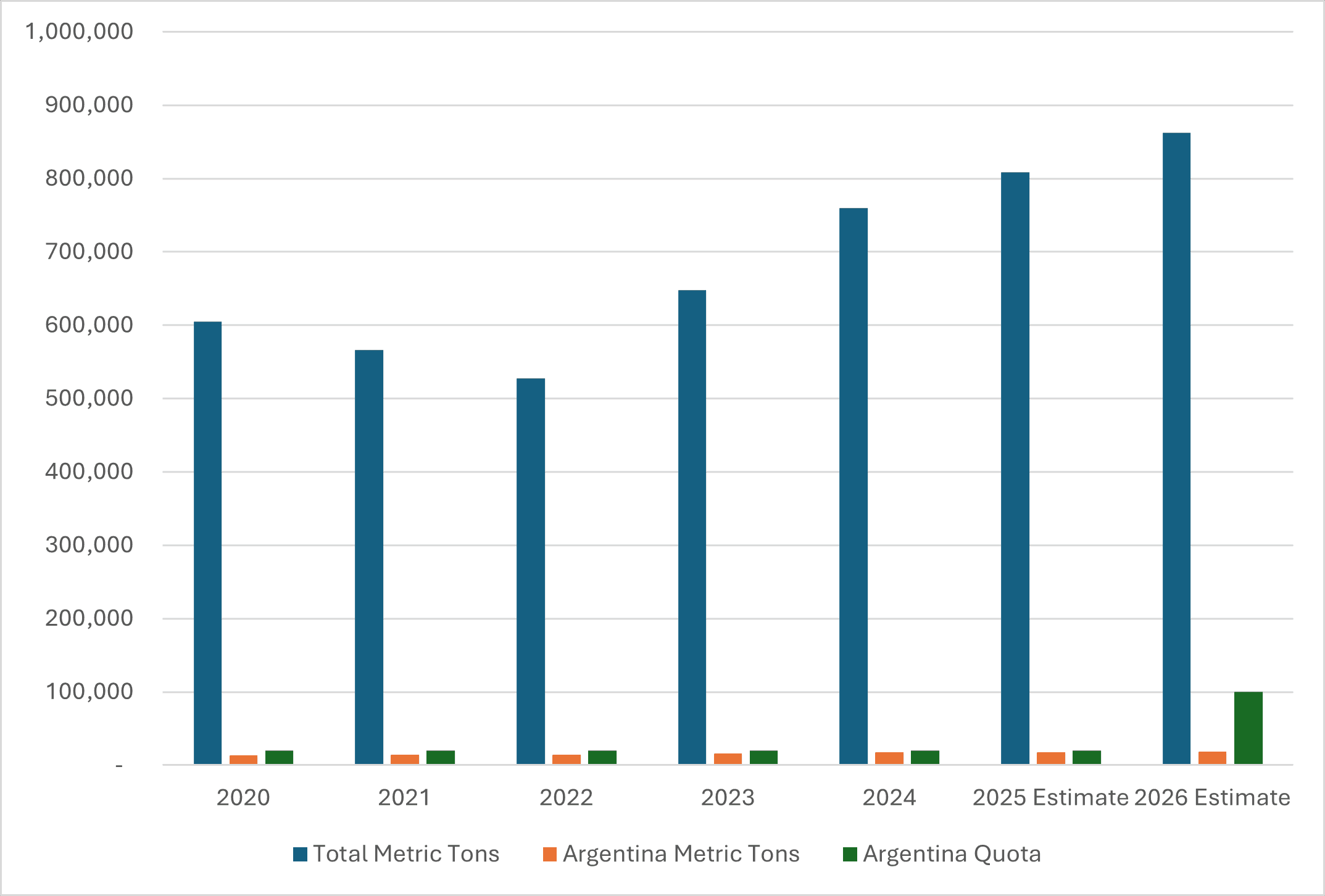 What’s Happening: On February 6, President Trump signed an executive order titled “Ensuring Affordable Beef for the American Consumer” that increases the tariff-rate quota (TRQ) for certain beef products from Argentina. This follows the recent signing of the U.S.-Argentina trade deal, first announced last November, which reduces some U.S. tariffs and is intended to expand U.S. market access. The beef executive order temporarily increases the TRQ by 80,000 metric tons of beef, a sharp increase from the current quota’s 20,000 to 100,000 by the end of 2026. The TRQ will increase on a quarterly basis, with the first tranche beginning February 13 and the last tranche being October 1 through December 31. The National Cattlemen’s Beef Association came out against the Trump Administration’s move that is aimed at lowering record high beef prices, stating that President Trump should “let the cattle markets work.” The president last used this same authority on December 31 to increase the TRQ for beef from the United Kingdom by 13,000 tons and decrease it by the same amount for other countries.