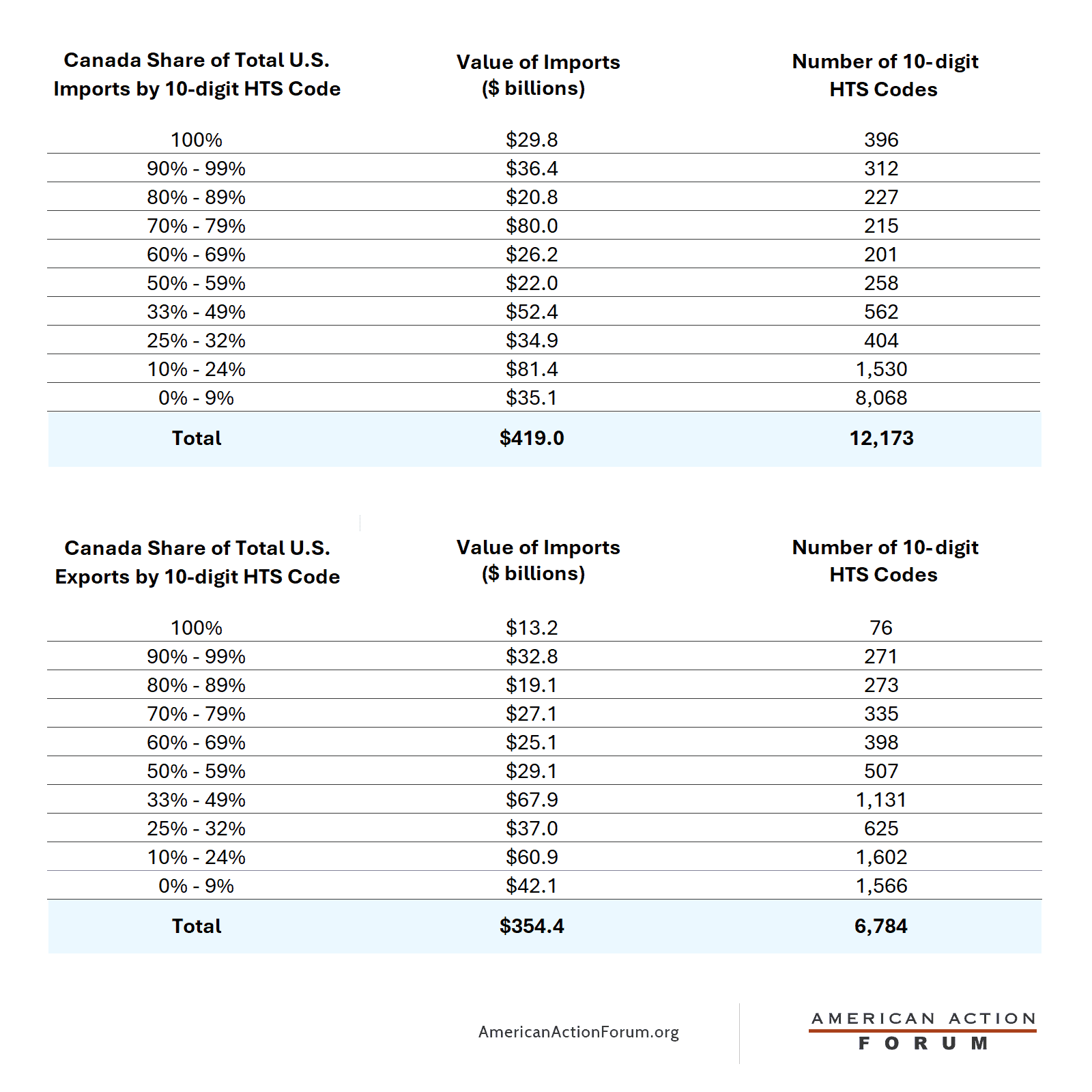 These charts display the value of U.S. imports from and exports to Mexico and Canada by how reliant the United States is on those countries. For example, 92 different U.S. imports valued at $9.5 billion are sourced 100 percent from Mexico. Additionally, 190 U.S. imports worth nearly $38.5 billion are sourced between 90—99 percent from Mexico. Furthermore, 75 U.S. exports valued at $900 million are 100 percent exported to Mexico. This analysis used 2023 Dataweb import and export data with 10-digit HTS codes.