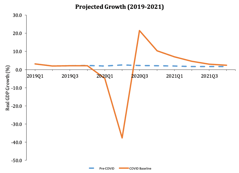 The new economic forecast reflects a similar outlook to other major post-COVID-19 analyses – a sharp uptick in economic activity in the third quarter of 2020 that only partially restores the economic gains of the past several years. GDP is expected to fall 11 percent in the 2nd quarter, or 38 percent at an annual rate.
