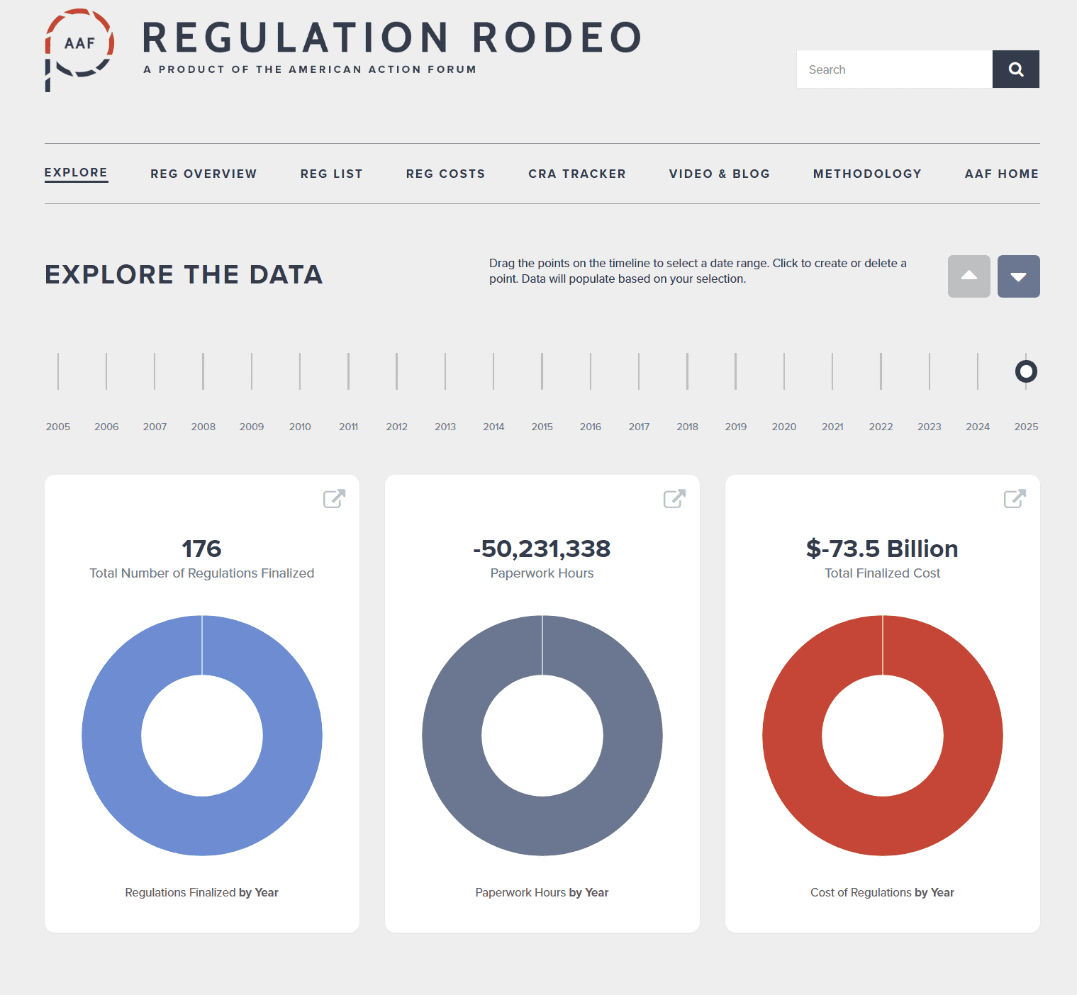The American Action Forum (AAF) is proud to announce a revamped version of our Regulation Rodeo (or, RegRodeo) project. For those unfamiliar with it, AAF’s RegRodeo database houses information on federal regulations going back to 2005. Launched in 2015, RegRodeo tracks every proposed and final rule published in the Federal Register that includes a quantified economic impact or paperwork burden estimate. This version makes the following improvements to the site: