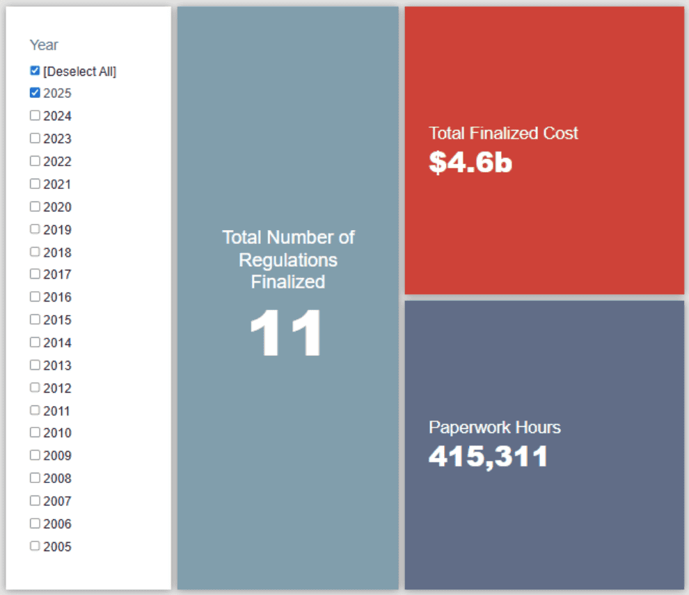 Since January 1, the federal government has published $36.6 billion in total net costs (with $4.6 billion in new costs from finalized rules) and 28.4 million hours of net annual paperwork cuts (with roughly 415,000 hours in increases from final rules).