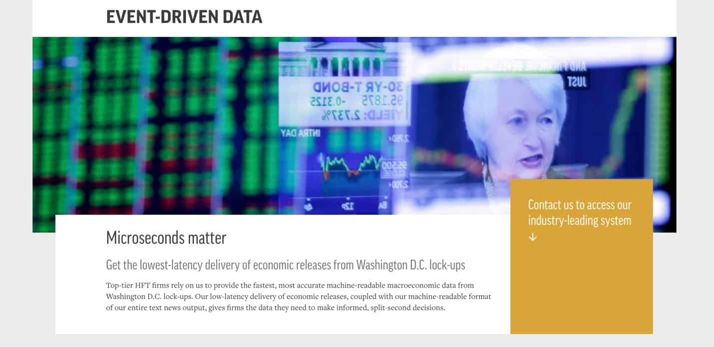 As the BLS notice explains, the facility was created in the mid-1980s as a way allow the media to digest the information before its public release so it could formulate accurate analysis of the data. The need for this has diminished over time as the Internet has allowed the information to be disseminated to anyone interested at the same time. In addition, DOL’s inspector general has recommended reforms to the facility since media has marketed its access as a competitive advantage for paying customers, such as high-frequency traders, to get ahead of market reactions to the news. The image below is cited by BLS as such marketing.