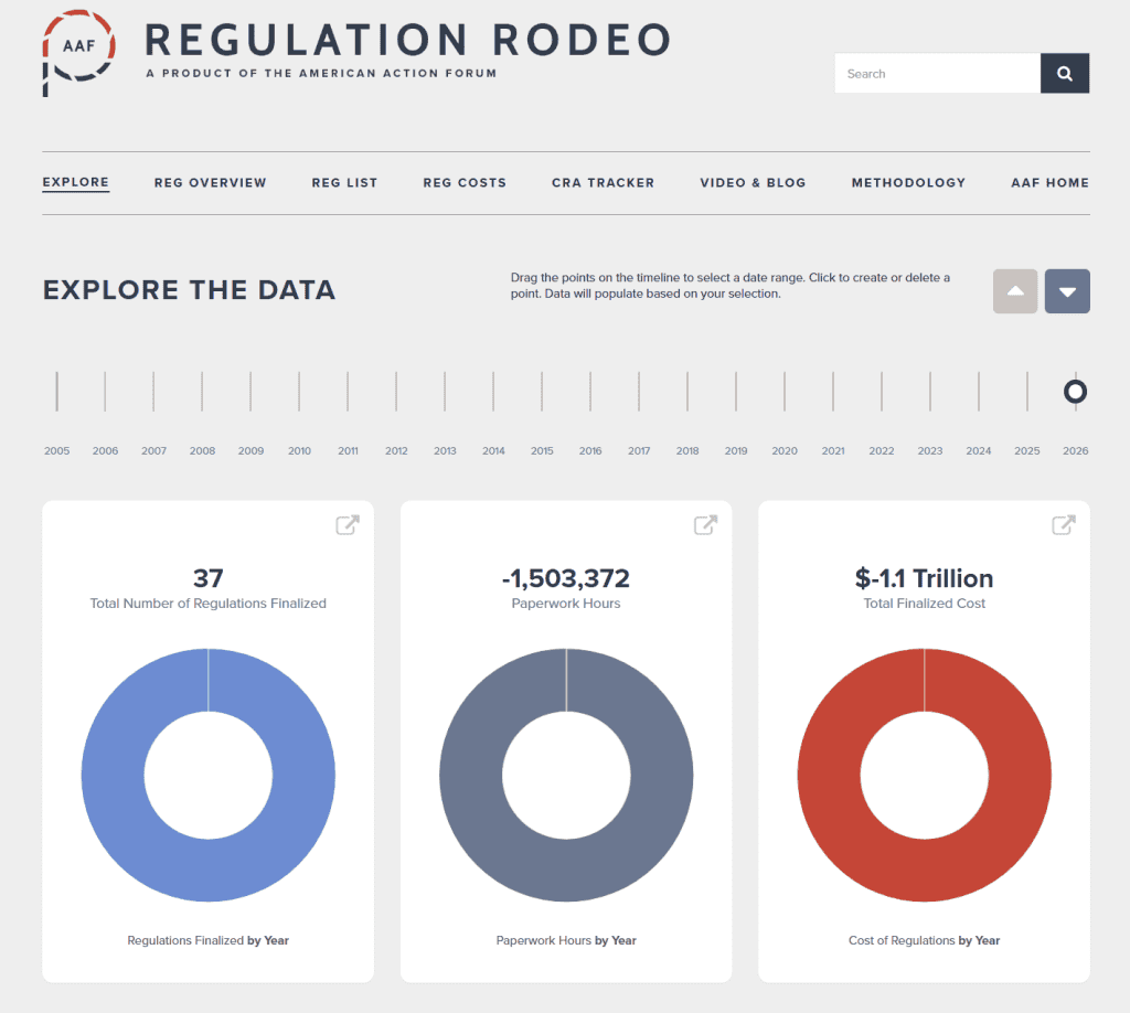 Since the start of 2026, the federal government has published $1.1 trillion in total regulatory net cost savings (with $1.1 trillion in reductions from finalized rules) and 27.9 million hours of net annual paperwork increases (with 1.5 million hours in reductions coming from final rules).
