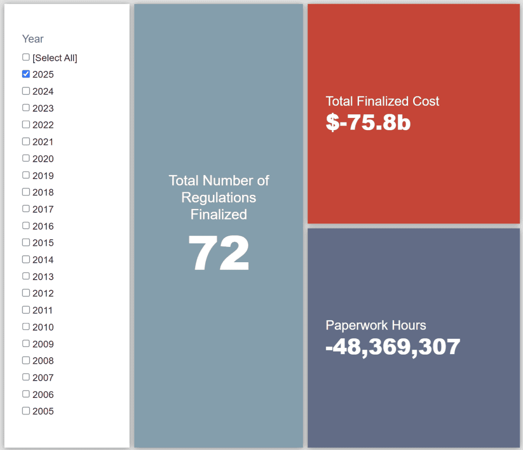 Since January 1, the federal government has published $105.5 billion in total net costs (with $75.8 billion in cost savings from finalized rules) and 69.5 million hours of net annual paperwork cuts (with 48.4 million hours coming from final rules).