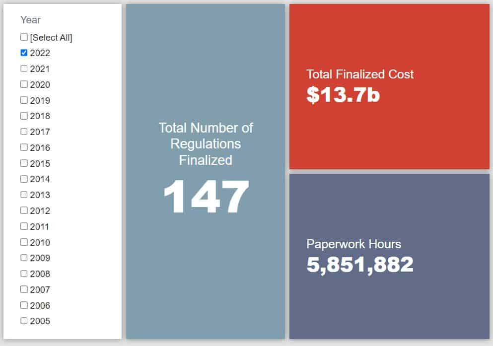 Since January 1, the federal government has published $100.9 billion in total net costs (with $13.7 billion in new costs from finalized rules) and 83.1 million hours of net annual paperwork burden increases (with 5.9 million hours in increases from final rules).