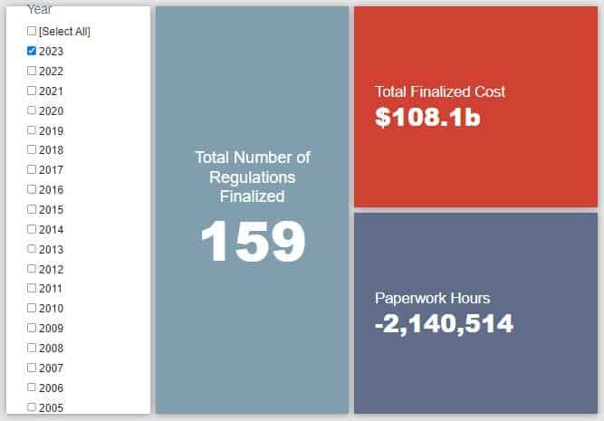 Since January 1, the federal government has published $529.4 billion in total net costs (with $108.1 billion in new costs from finalized rules) and 161.1 million hours of net annual paperwork burden increases (with 2.1 million hours in decreases from final rules).