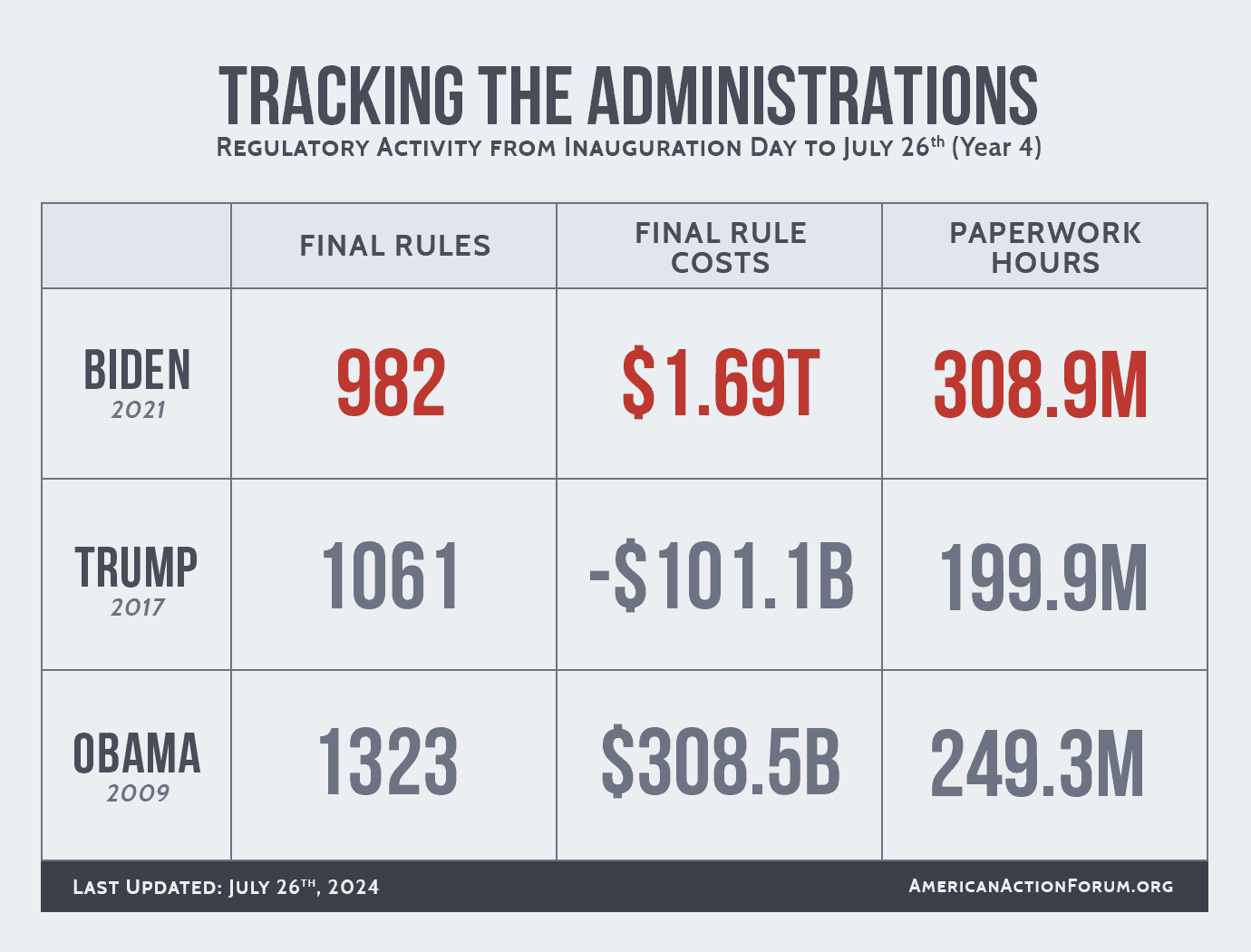 In terms of trends across the administration covered here, there was not much to report from late July in the fourth year of each administration. The burdens from the FTC Eyeglass Rule discussed above provided the bulk of the $122 million- and 2.1-million-hour bump in the Biden Administration’s final rule costs and paperwork totals, respectively. For the other two administrations, the most notable movement came during the Obama years when a defense contractor rulemaking included roughly 75,000 hours of paperwork.