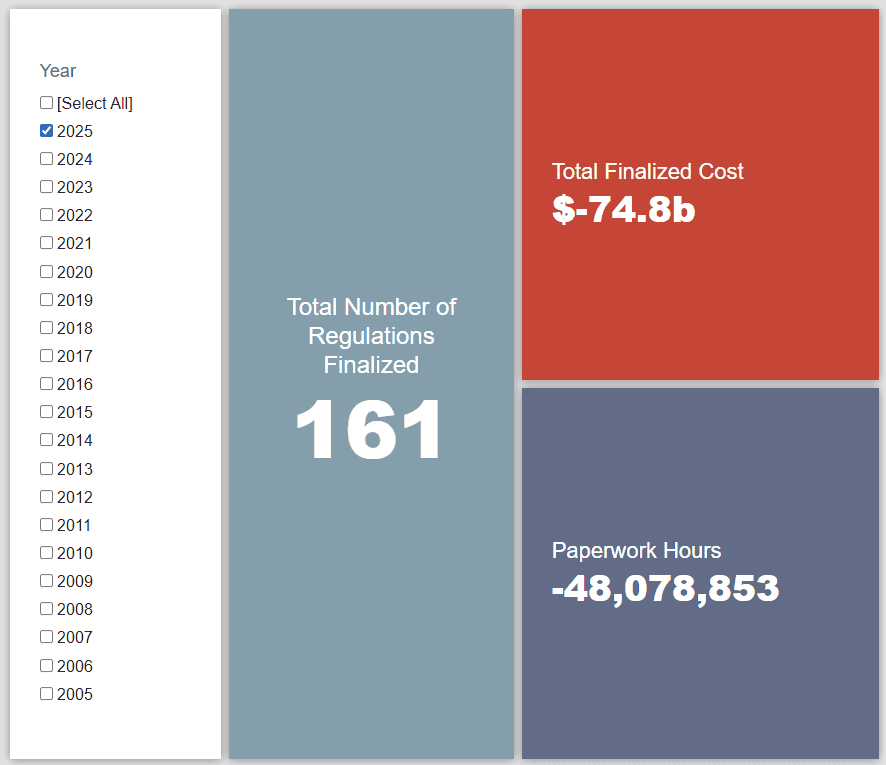 Since January 1, the federal government has published $702.8 billion in total regulatory net cost savings (with $74.8 billion in cost savings from finalized rules) and 69.6 million hours of net annual paperwork cuts (with 48.1 million hours coming from final rules).