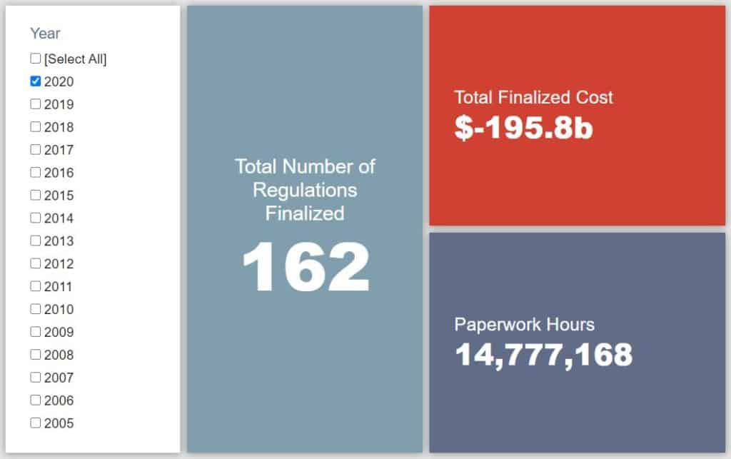 The Trump Administration expected to reach $51.6 billion in cumulative net savings in FY 2020. To date in the fiscal year, agencies have officially published 95 deregulatory actions and 31 regulatory actions, totaling $198 billion in quantified total net cost savings.