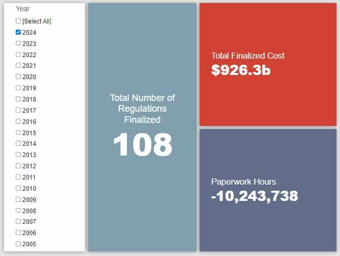 Since January 1, the federal government has published $960.6 billion in total net costs (with $926.3 billion in new costs from finalized rules) and 13.9 million hours of net annual paperwork burden increases (with 10.2 million hours in reductions coming from final rules).