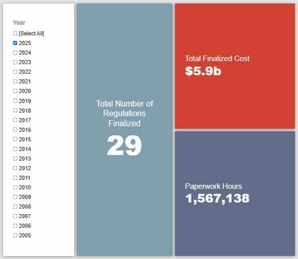 Since January 1, the federal government has published $113.6 billion in total net costs (with $5.9 billion in new costs from finalized rules) and 25.2 million hours of net annual paperwork cuts (with 1.6 million hours in increases from final rules).