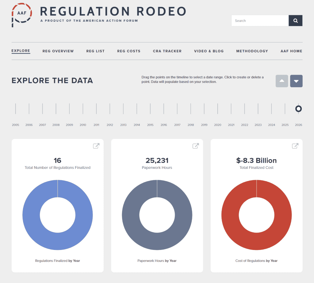 Since the start of 2026, the federal government has published $3 billion in total regulatory net cost savings (with $8.3 billion in reductions from finalized rules) and 2.1 million hours of net annual paperwork increases (with 25,231 hours coming from final rules).