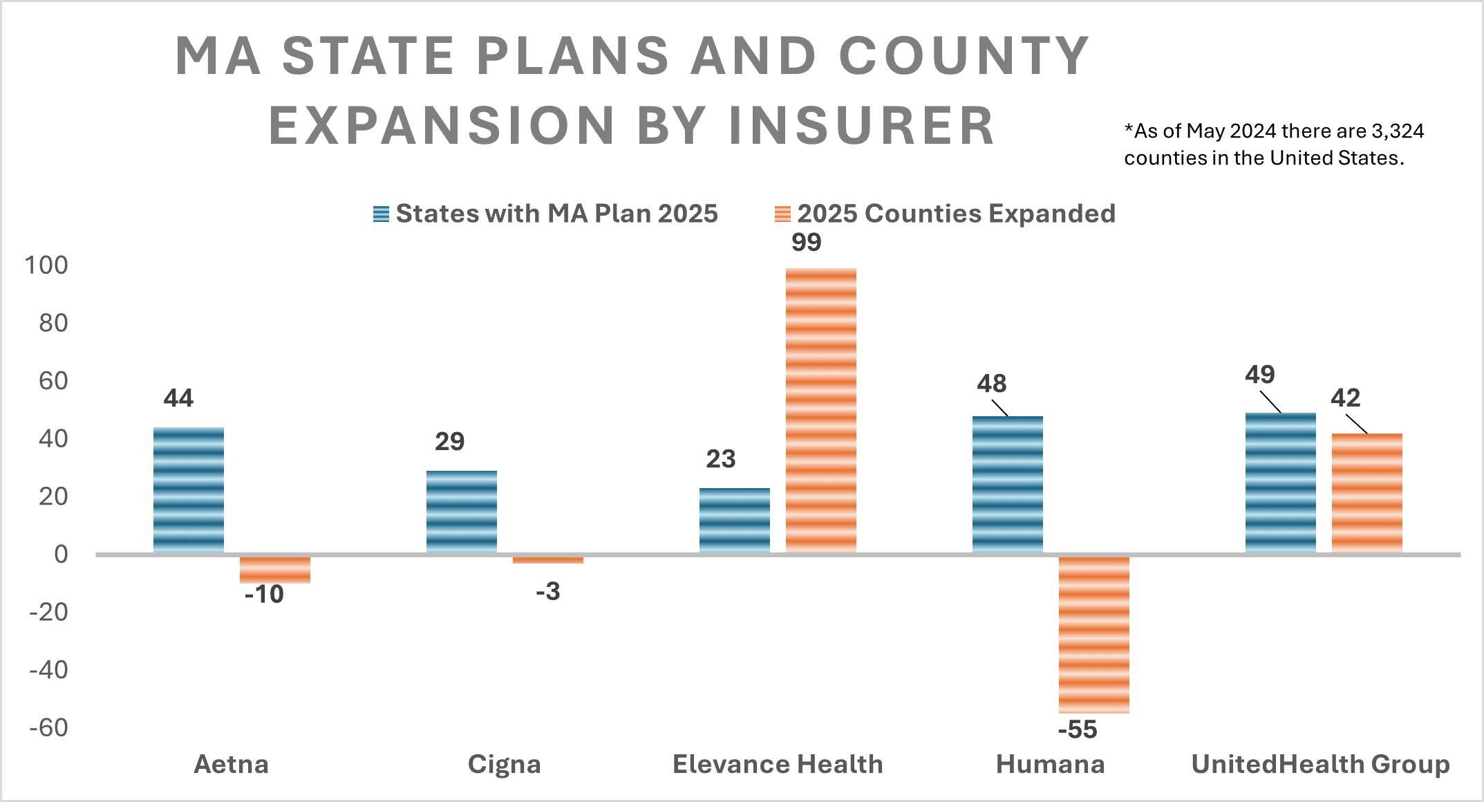 Elevance Health and UnitedHealth announced moderate expansions of their MA footprint, adding 99 and 42 counties to their respective MA plans. Conversely, Aetna, Humana, and Cigna announced reductions in counties served. Yet the five insurers project only minimal changes to the total states in which they offer MA plans. The graph below illustrates the number of states in which the five largest insurers operate, as well as the net change in counties served between fiscal years 2024 and 2025. Of note is the net change in total U.S. counties served in 2025 – a 73-county increase from 2024.