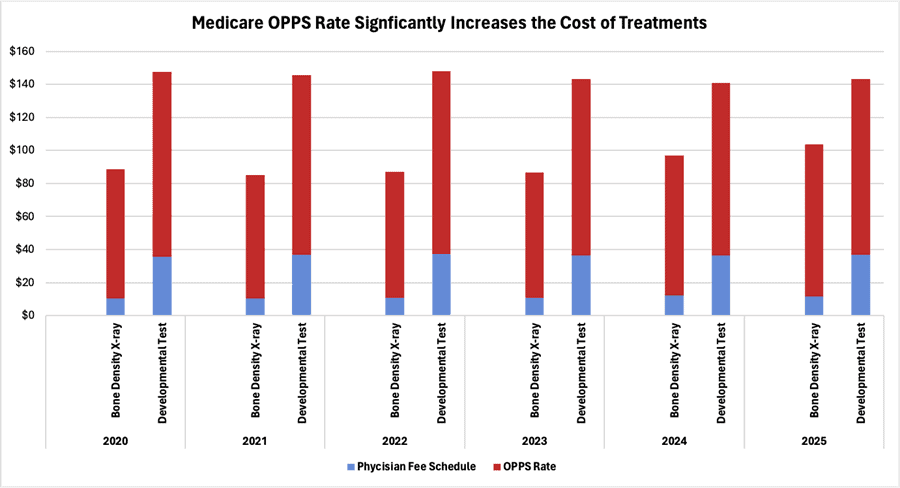The chart below illustrates the average Medicare reimbursement for two outpatient treatments. Medicare determines payments made to providers using the physician fee schedule (PFS) – reflecting the agreed-upon cost of the service delivered – in addition to the Outpatient Prospective Payment System (OPPS) rate, which incorporates a hospital facility fee. Over the past five years and continuing into 2025, hospitals received an average reimbursement more than 600 percent higher than for physician offices for bone density X-rays. For developmental tests, hospital reimbursements were nearly 200 percent more than physician office payments during the same period. A solution to this trend, as proposed by many health care stakeholders, is the adoption of “site neutral” Medicare reimbursement rates. “Site neutrality” aligns payments for treatments delivered in all settings, meaning HOPDs and physician offices receive the same reimbursement rates from Medicare for the same services. If Congress succeeds in enacting site neutrality provisions for Medicare programs, the Congressional Budget Office estimates that those reforms could save taxpayers more than $100 billion over the next 10 years