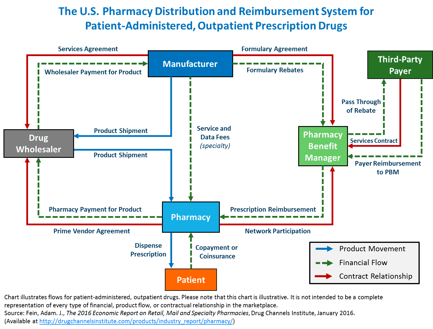 Distribution of prescription drugs begins at wholesalers. These entities have service agreements with drugmakers to sell products to pharmacies and hospitals. The price wholesalers receive from manufacturers serves as an important benchmark, as well as a starting point for future fees, discounts, rebates, and other price adjustments occurring down the drug channel.
