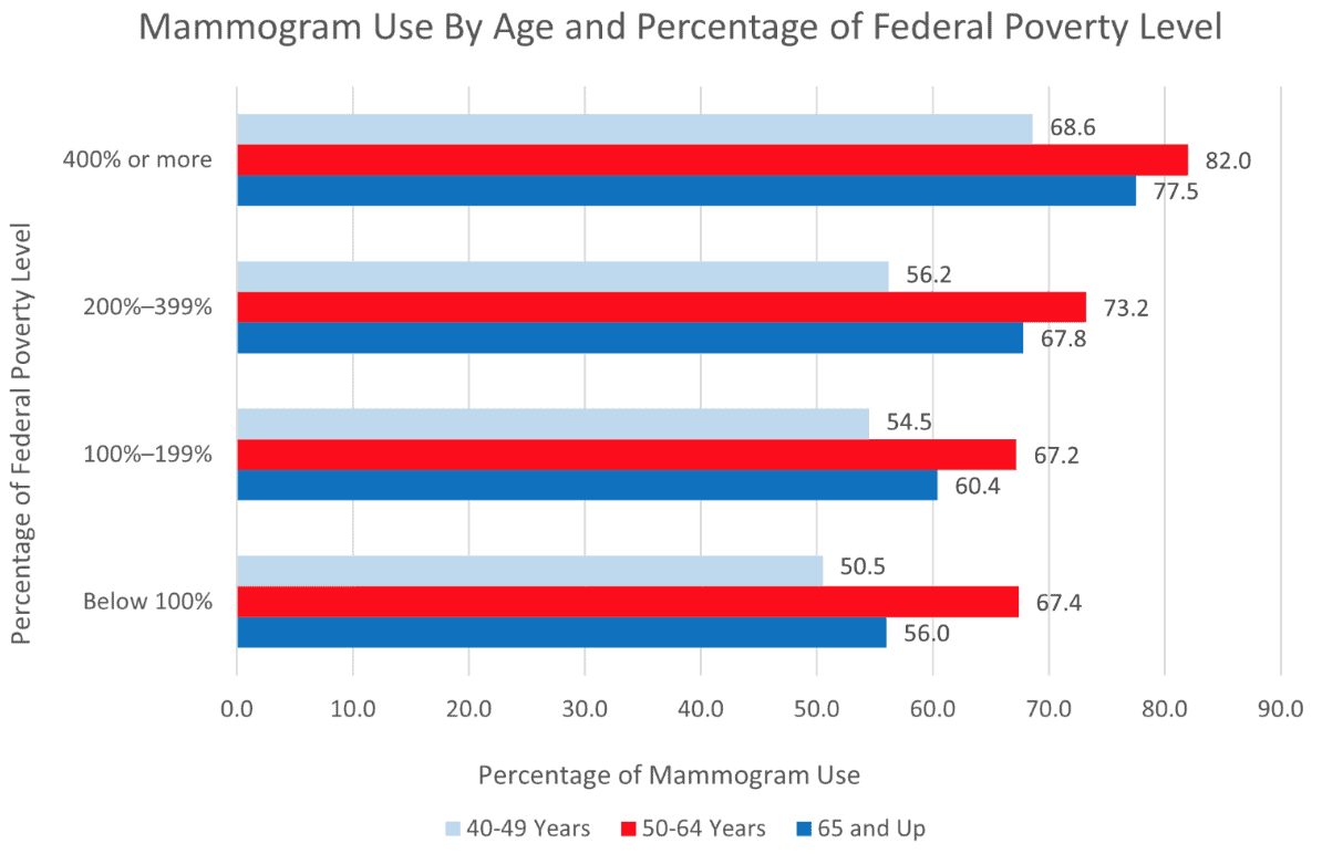 Women aged 40–49 who earn below 100 percent of the federal poverty level (FPL) are least likely to have received their recommended mammogram (50.5 percent). While the percentage of these women in the 40–49 age group who received their recommended preventative mammogram within the past two years increases to 68.6 percent among those who earn 400 percent or more of the FPL, they still trail women aged 50–64 and 65 and older at the same level of income.